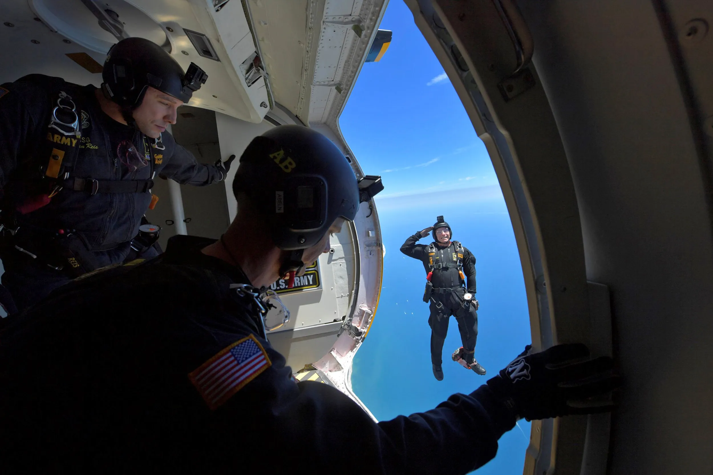 Members of the U.S. Army's Golden Knights parachute team perform during the Bethpage Air Show as part of a Memorial Day event at Jones Beach on Long Island, New York, U.S., May 25, 2019. (Photo by Johnny Milano/Reuters)