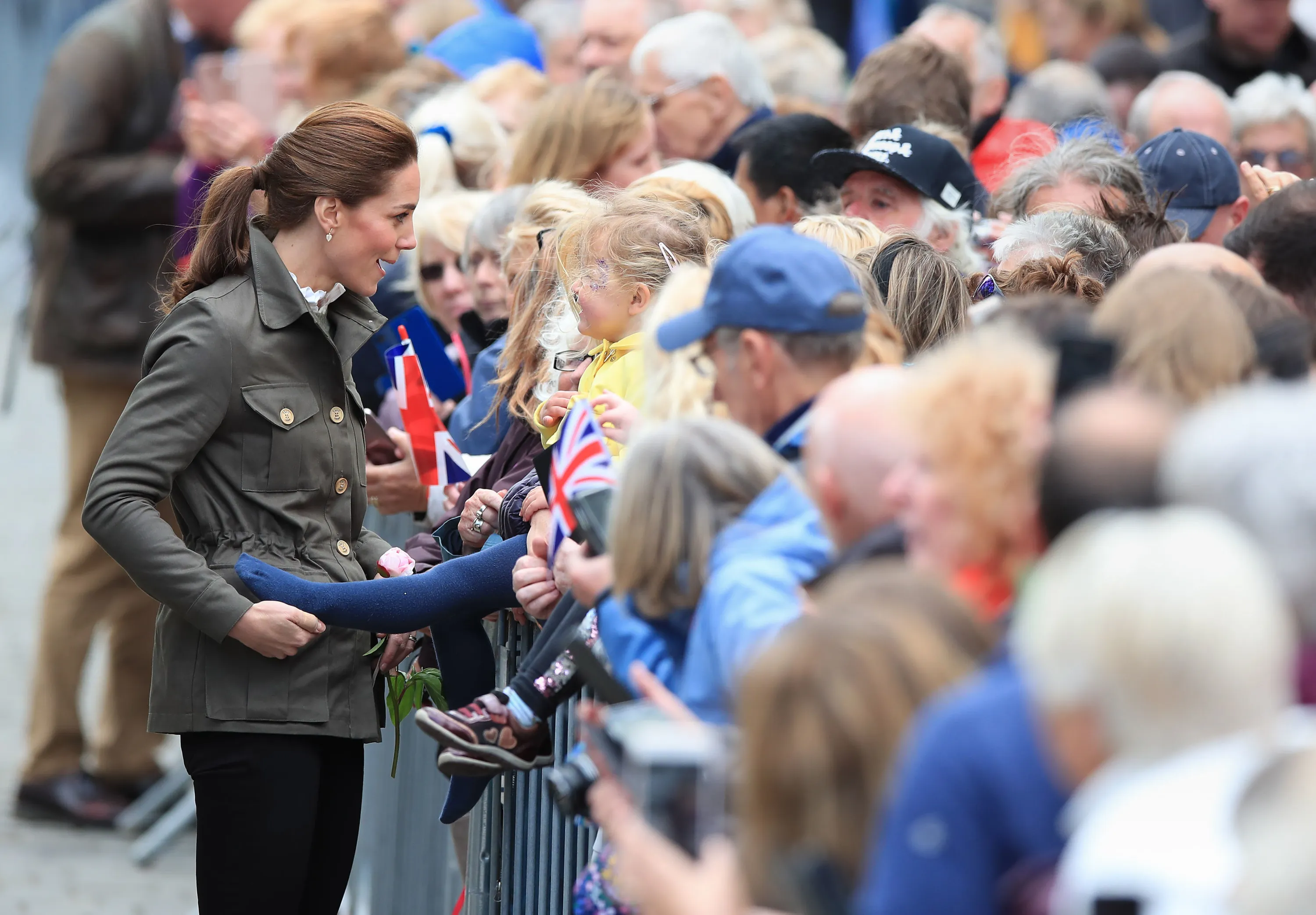 Catherine, Duchess of Cambridge meets members of the public they visit Keswick Market place during a visit to Cumbria on June 11, 2019 in Keswick, England. The royal couple visited Keswick to join a celebration to recognise the contribution of individuals and local organisations in supporting communities and families across Cumbria. They then went on to visit a traditional fell sheep farm. (Photo by Peter Byrne/PA Wire Press Association)