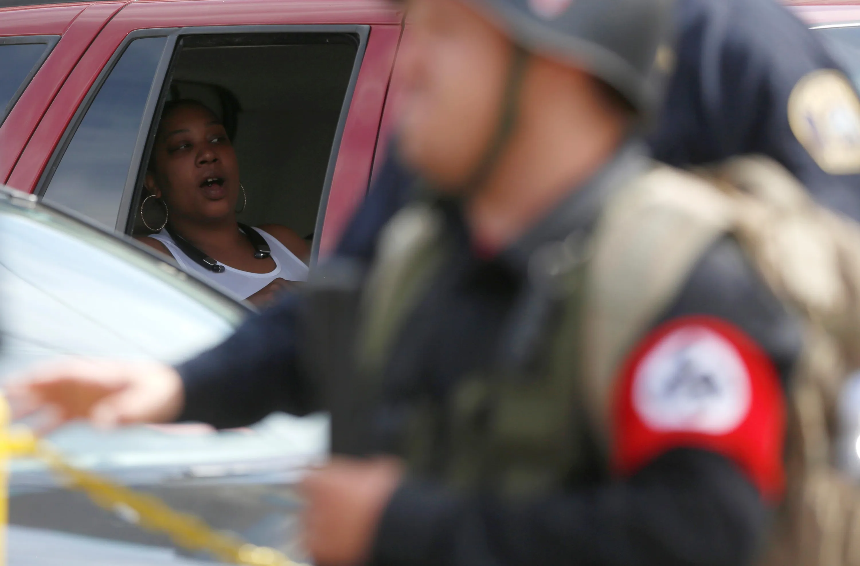 A woman watches as members of the National Socialist Movement, a white nationalist group, demonstrate against the LGBTQ event Motor City Pride in Detroit, Michigan, U.S. June 8, 2019. (Photo by Jim Urquhart/Reuters)