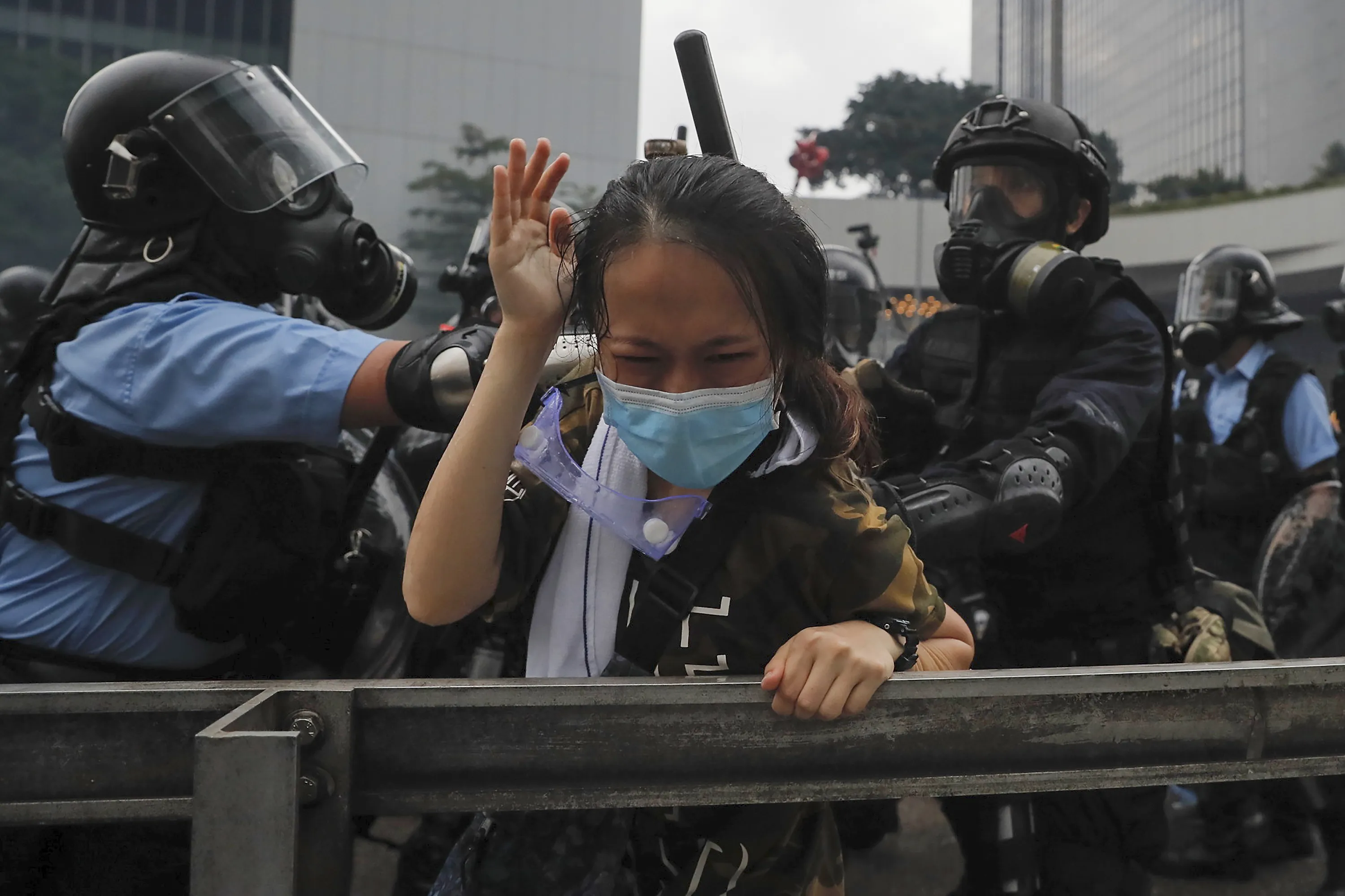 In this Wednesday, June 12, 2019, file photo, a protester reacts as she tackled by riot police during a massive demonstration outside the Legislative Council in Hong Kong. (Photo by Kin Cheung/AP Photo/File)