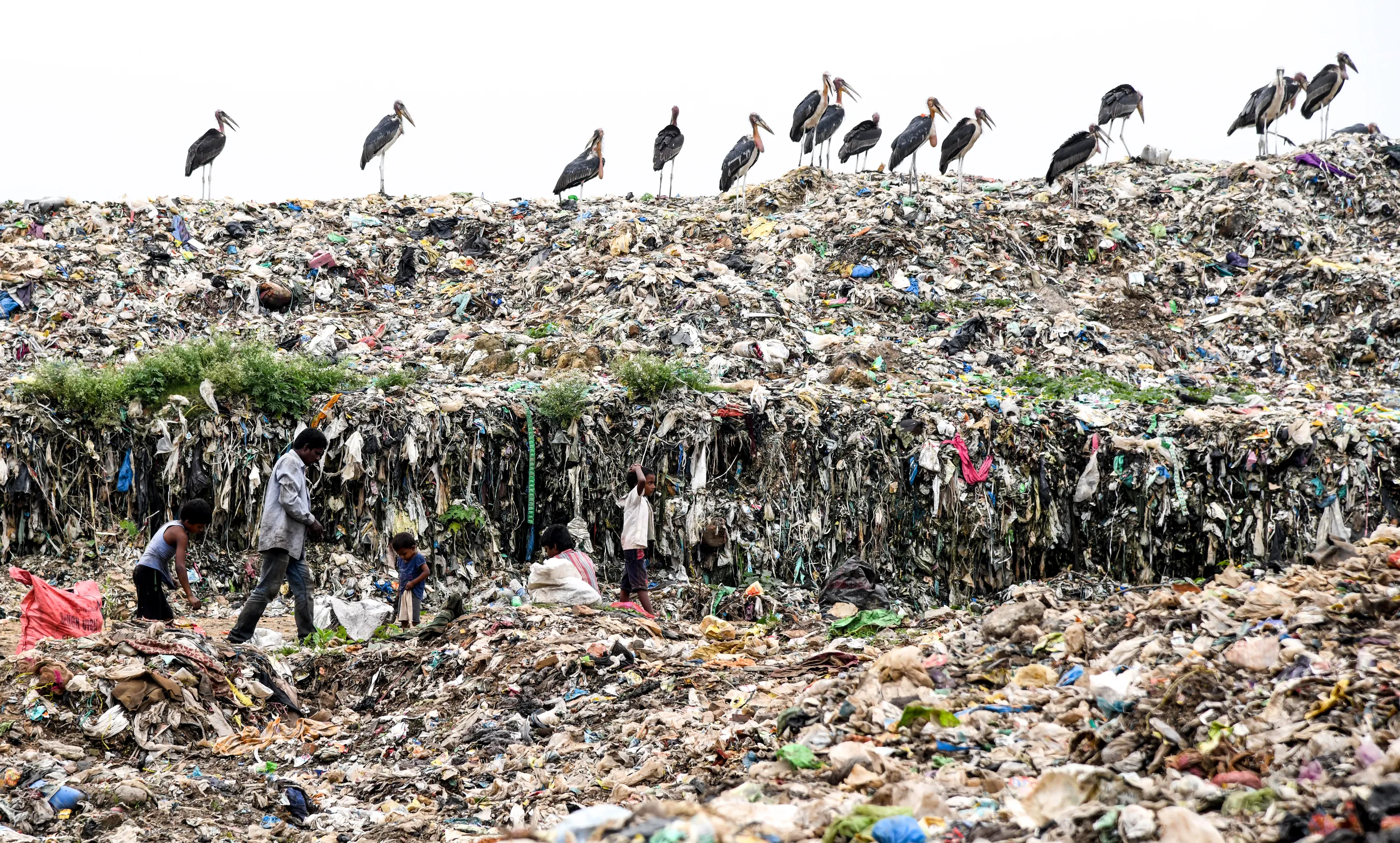 Indian rag pickers look for recyclable materials as greater adjutant storks stand on the top of one of the largest disposal sites in northeast India at the Boragaon area of Guwahati on June 4, 2019, ahead of the “World Environment Day”. The World Environment Day, annually marked on June 5, is a way to encourage awareness and action to protect the environment. (Photo by Biju Boro/AFP Photo)