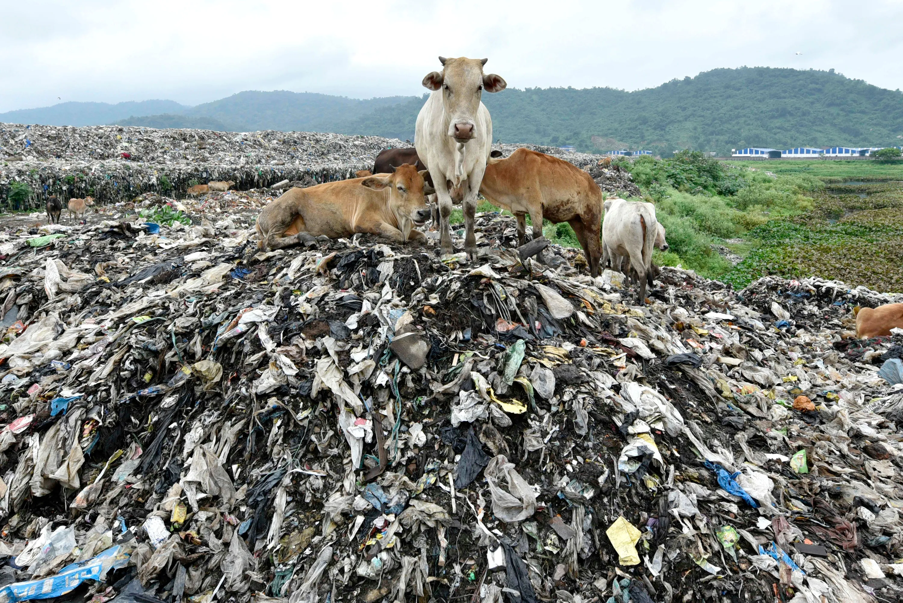 Cows on a pile of garbage, at one of the largest disposal sites in Northeast India in the Boragaon area on June 4, 2019, ahead of “World Environment Day”. (Photo by David Talukdar/Rex Features/Shutterstock)