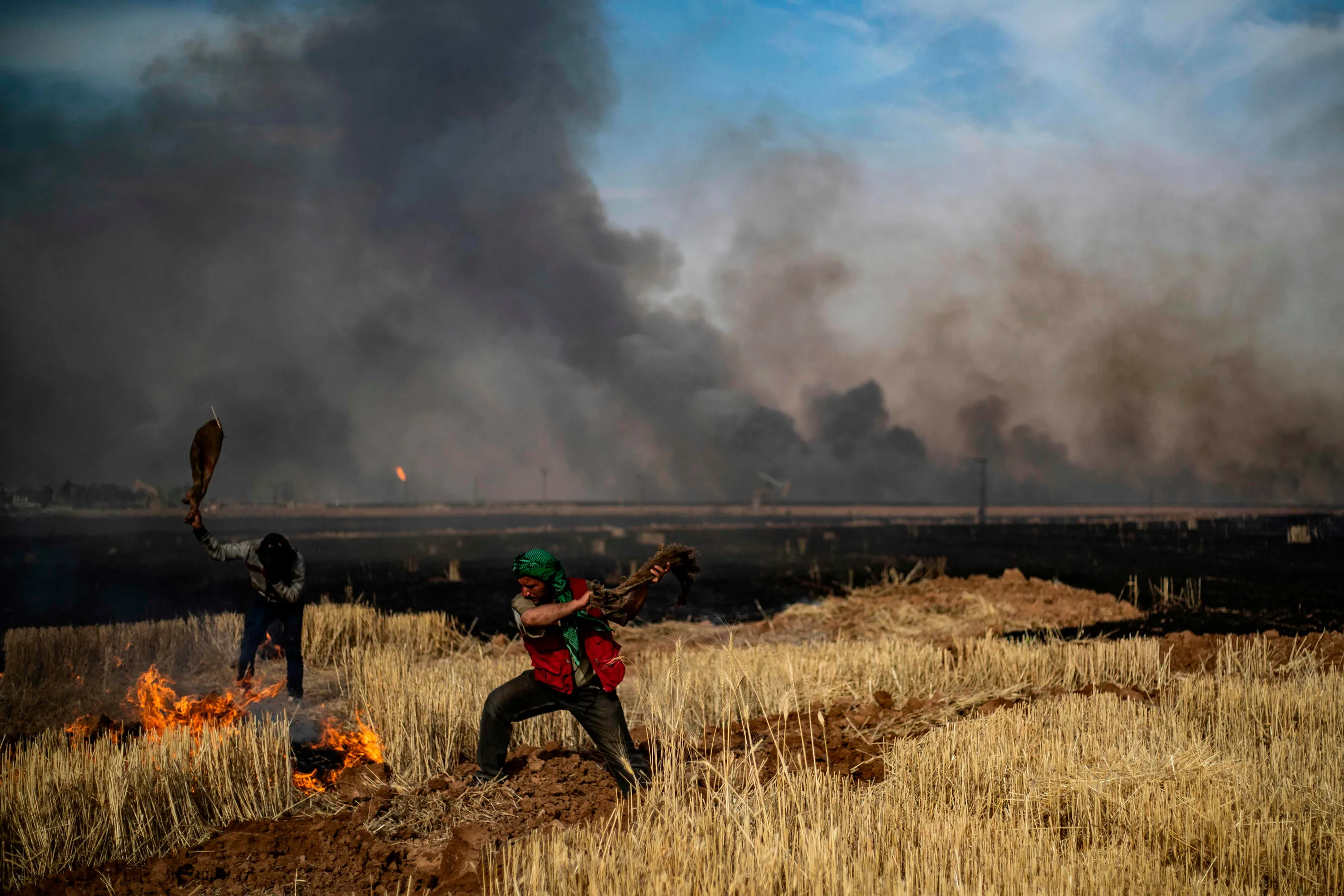 People battle a blaze in an agricultural field in the town of al-Qahtaniyah, in the Hasakeh province near the Syrian-Turkish border on June 10, 2019. Fires have erupted in various parts of Syria in recent weeks, with all sides blaming each other for starting them In the Kurdish-run breadbasket province of Hasakeh, of which Al-Qahtaniya is part, IS has claimed several arson attacks on wheat fields. (Photo by Delil Souleiman/AFP Photo)