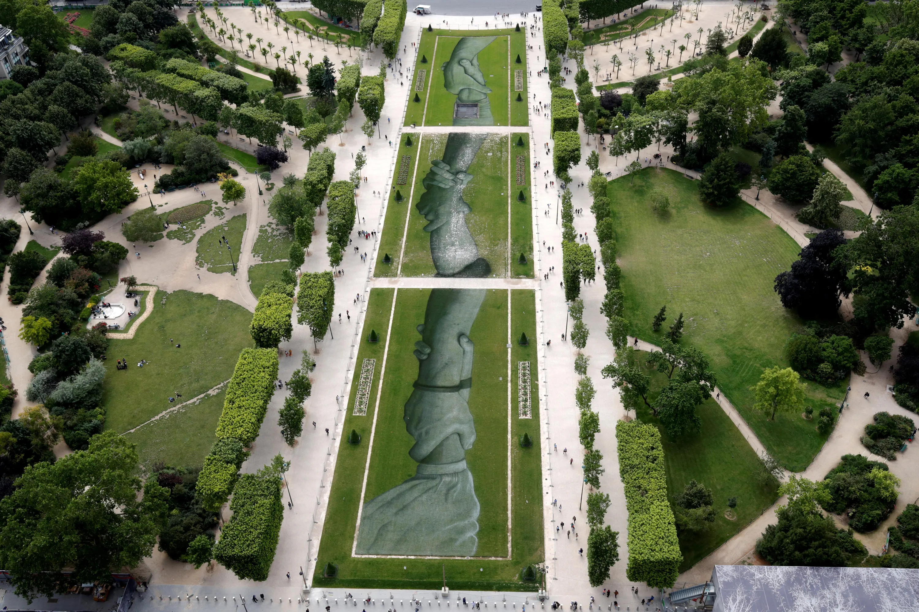 A giant fresco painted on the “Champs de Mars” lawn by French street artist Saype is seen from the Eiffel Tower on June 14, 2019 in Paris, France. The 600 metre long fresco, painted on the Champs de Mars lawn, pays tribute to the work of the “SOS Mediterranee” migrant charity association. This artwork is seen for the first time in front of the Eiffel Tower, before being reproduced throughout the world for three years in the cities of Geneva, Berlin, Belfast, Buenos Aires, Christchurch, London, Melbourne, New York and Nairobi. (Photo by Philippe Wojazer/Reuters)