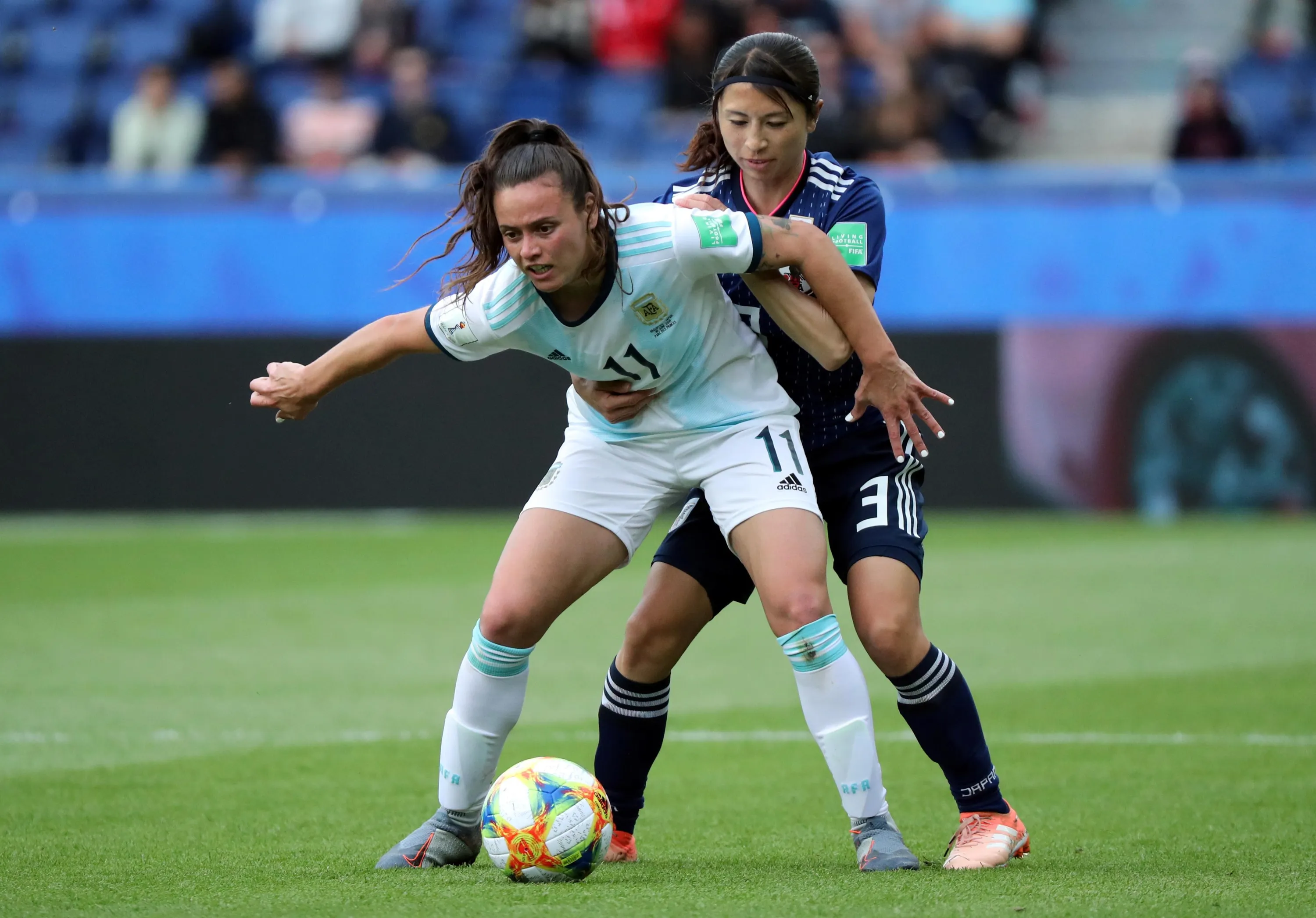 Argentina's Florencia Bonsegundo and Japan's Aya Sameshima challenge for the ball during the Women's World Cup Group D soccer match between Argentina and Japan at the Parc des Princes in Paris, France, Monday, June 10, 2019. (Photo by Lucy Nicholson/Reuters)