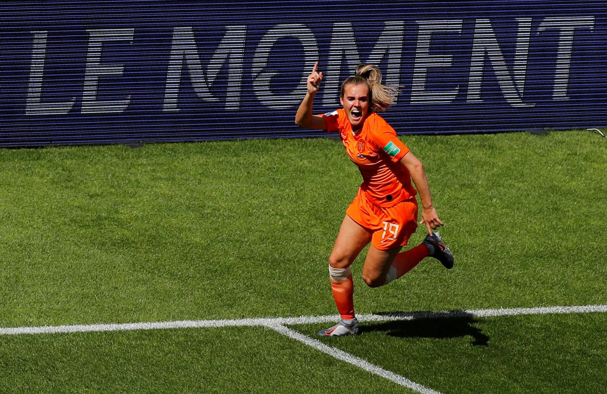 Netherlands' midfielder Jill Roord (C) celebrates after scoring a goal during the France 2019 Women's World Cup Group E football match between New Zealand and the Netherlands, on June 11, 2019, at the Oceane Stadium in Le Havre, northwestern France. (Photo by Phil Noble/Reuters)