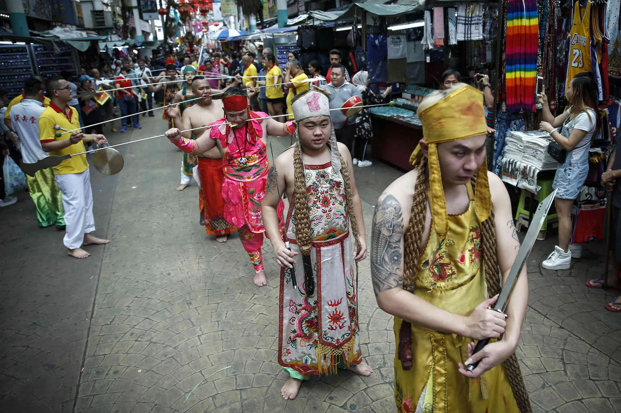 Chinese devotees with their cheeks pierced with skewers take part in a procession during the Guan Ping Festival in Chinatown in Kuala Lumpur, Saturday, June 15, 2019. The festival is held in celebration of the birthday of Chinese deity Guan Ping is believed to bring prosperity for local businesses. (Photo by F.L. Wong/AP Photo)