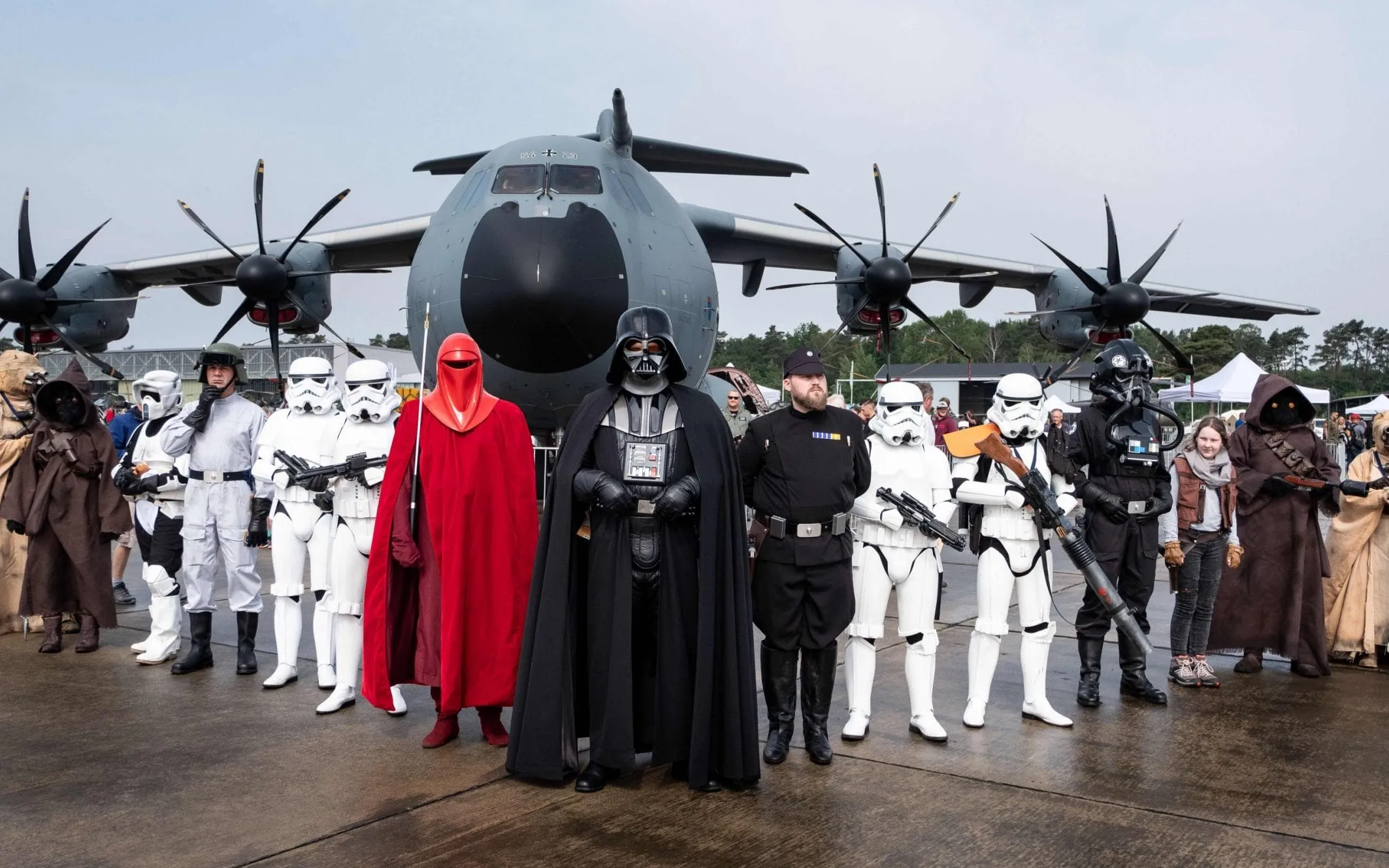 Visitors in Star Wars costumes pose in front of a Herkules plane during the “Tag der Bundeswehr” (Day of the German Armed Forces) at the air base in Fassberg, northern Germany, on June 15, 2019. (Photo by Peter Steffen/dpa/AFP Photo)