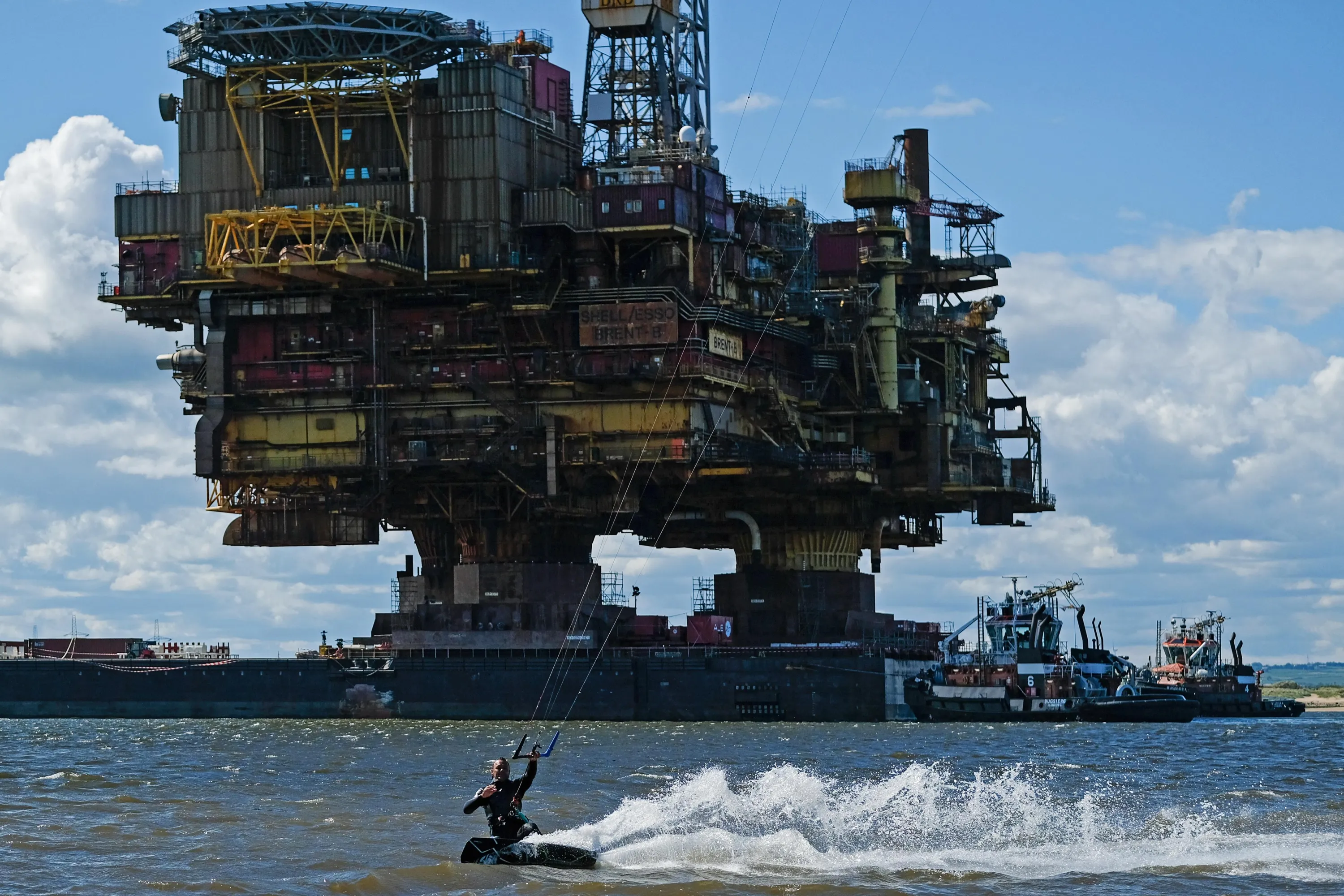 Kitesurfer Terry Bennions surfs in front of the Brent Bravo topside oil platform as it is transported on the barge Iron Lady into the mouth of the River Tees on route to the Able UK Seaton Port site for decommissioning on June 20, 2019 in Teesport, England. The 24,800 tonne oil platform was transported to an area off the Hartlepool coast by the largest heavy lift vessel ever built, Pioneering Spirit from the Shell Brent oil fields that are situated 115 miles north-east of Lerwick in Scotland. After arriving off the coast of Hartlepool the 410ft high platform was transferred to the barge to be towed into the mouth of the River Tees. This is the second oil platform to be removed from the Shell Brent oil field with the sister platform, Brent Delta decommissioned at the same site in 2017. Once at the Able UK site Brent Bravo will be broken down with some parts being re-sold and the rest scrapped and re-cycled. At its peak in 1982 the four Shell platforms in the Brent field were producing more than half a million barrels of oil a day. Production at the field was stopped in 2011. (Photo by Ian Forsyth/Getty Images)