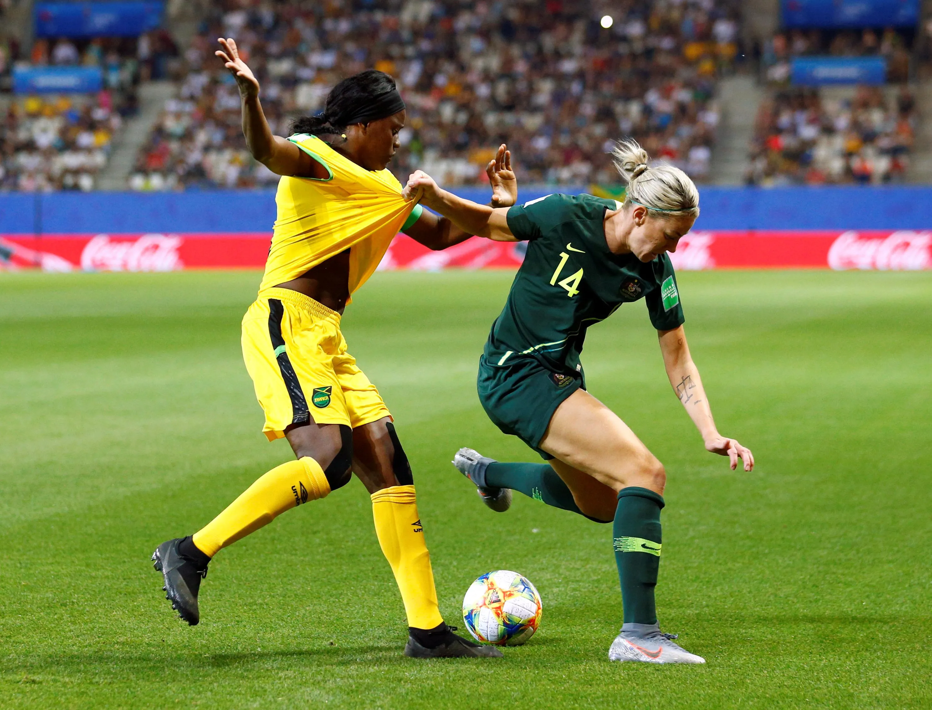 Jamaica's Konya Plummer in action with Australia's Alanna Kennedy during the Jamaica V Australia, Group C match at the FIFA Women's World Cup at Stade des Alpes on June 18th 2019 in Grenoble, France. (Photo by Emmanuel Foudrot/Reuters)