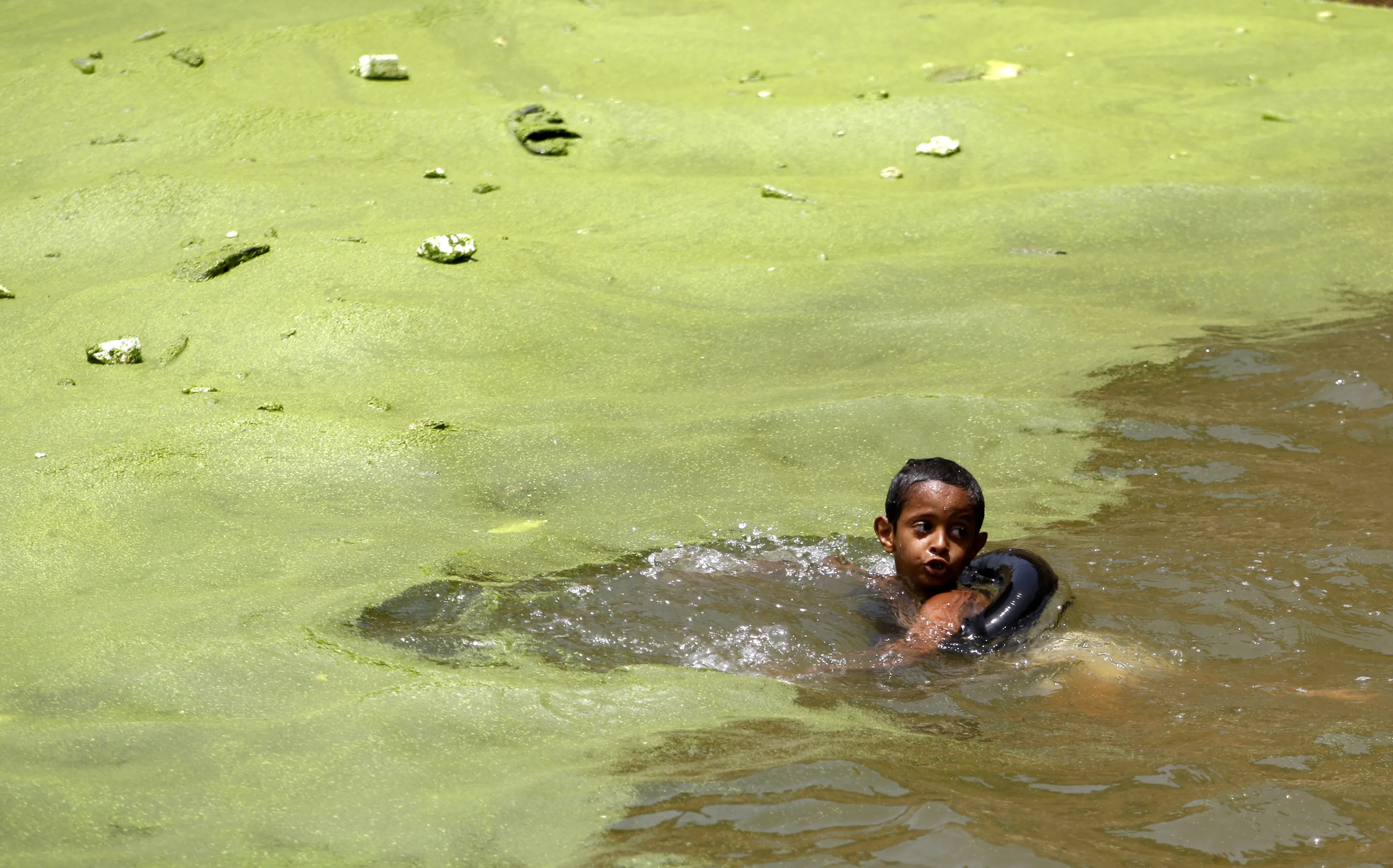 A boy swims in polluted water to beat the heat in the western Yemeni city of Hajja on June 9, 2010. (Photo by Khaled Abdullah/Reuters)