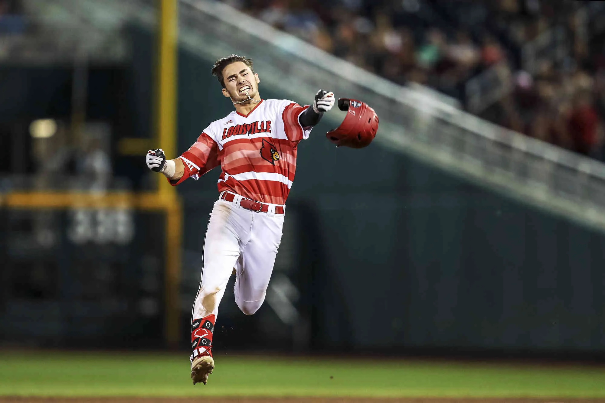 Louisville's Drew Campbell celebrates after driving in the winning run against Mississippi State during an NCAA College World Series baseball game Thursday, June 20, 2019, in Omaha, Neb. (Photo by Elsie Stormberg/Omaha World-Herald via AP Photo)