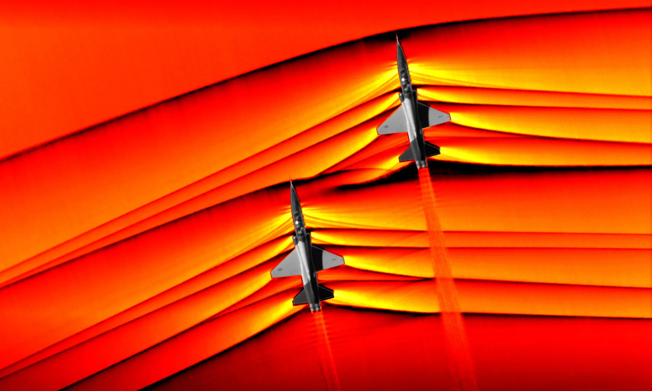 An undated handout photo made available by NASA photo shows two T-38 aircrafts in supersonic speed with shockwaves around them, at NASA’s Armstrong Flight Research Center in Edwards, California, USA, Issued 07 March 2019. According to press release, NASA has successfully tested an advanced air-to-air photographic technology that captured the first ever images of the interaction of shockwaves from two T-38 supersonic aircrafts in flight. When aircrafts fly faster than the speed of sound, shockwaves travel away from it and is heard on the ground as a sonic boom, this imagery will allow researchers to study these shockwaves in an effort to make sonic booms quieter which may open future possibilities for supersonic flight over land. The images are originally monochromatic and shown here as colorized composite images. (Photo by Photo by EPA/EFE/NASA)