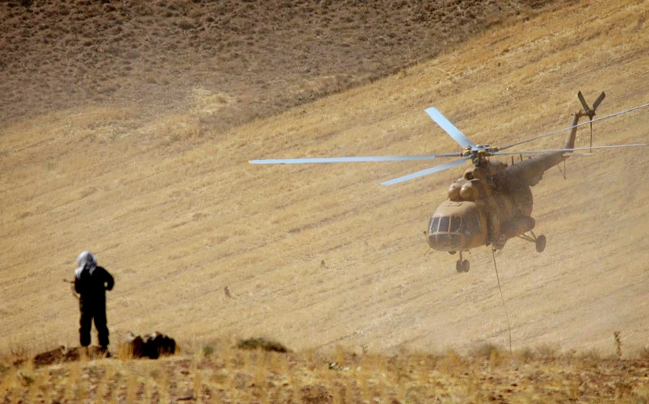 An Iranian sniper stands on a hill as a helicopter flies overhead during Revolutionary Guards military manoeuvres in western Iran, September 18, 2004. (Photo by Fars News Agency MN/DBP via Reuters)
