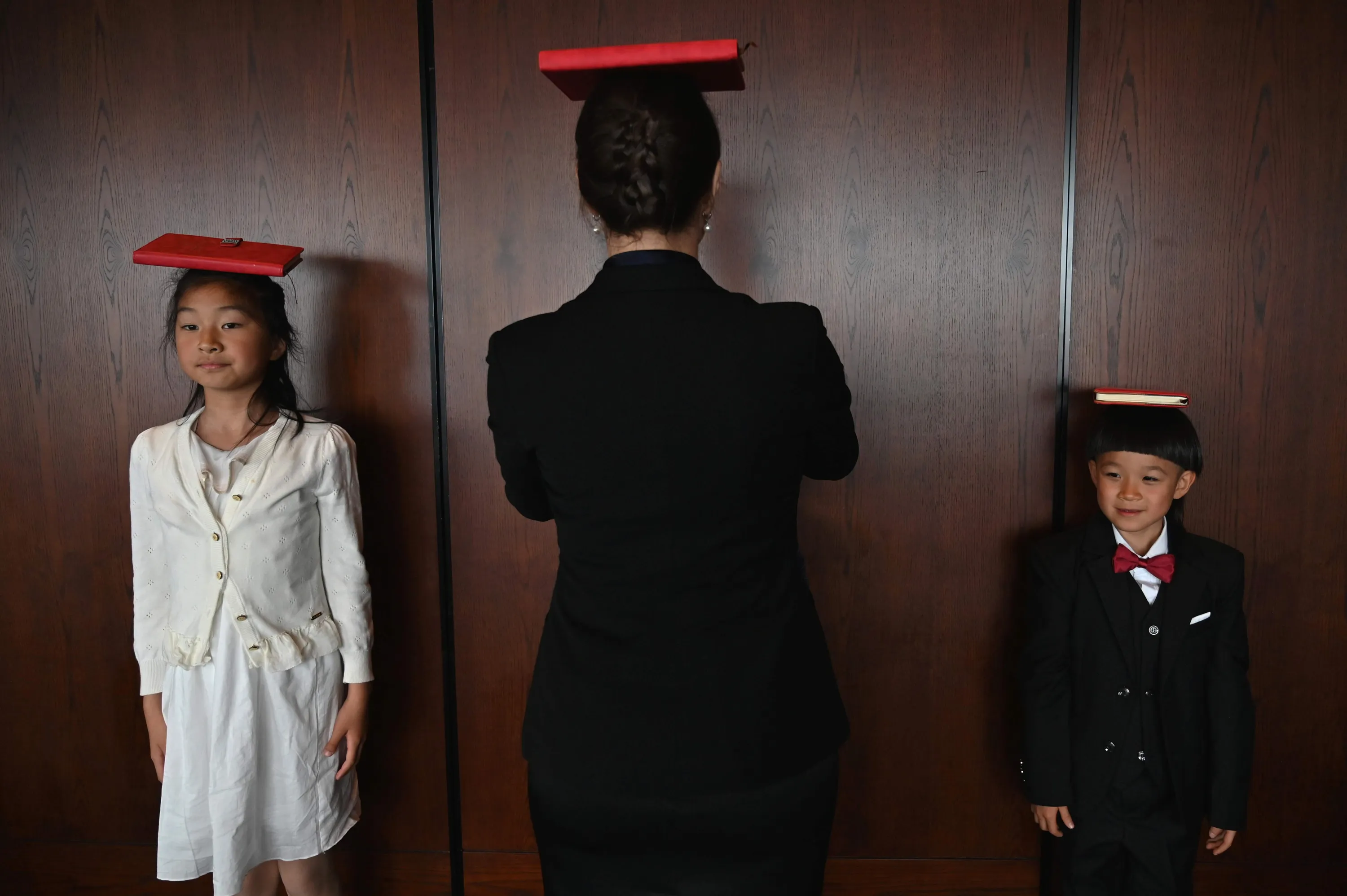 This picture taken on June 1, 2019 shows Miona Milakov (C) teaching children how to balance a book on their head during an etiquette and manners class in central Shanghai. (Photo by /Reuters)