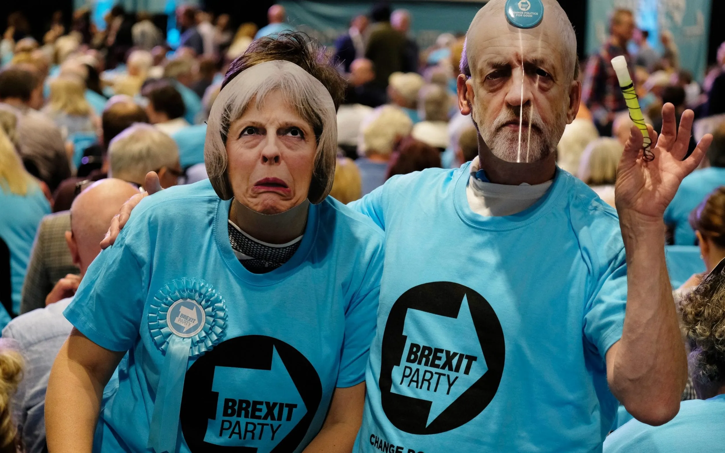 Brexit Party supporters wear masks depicting politicians Jeremy Corbyn and Theresa May as they attend the party's Big Vision Rally at the National Exhibition Centre on June 30, 2019 in Birmingham, England. Organisers have said they are expecting 5000 attendees as the leadership unveiled the first 100 plus prospective parliamentary candidates who have been selected for any future Westminster elections. (Photo by John Robertson/The Telegraph)
