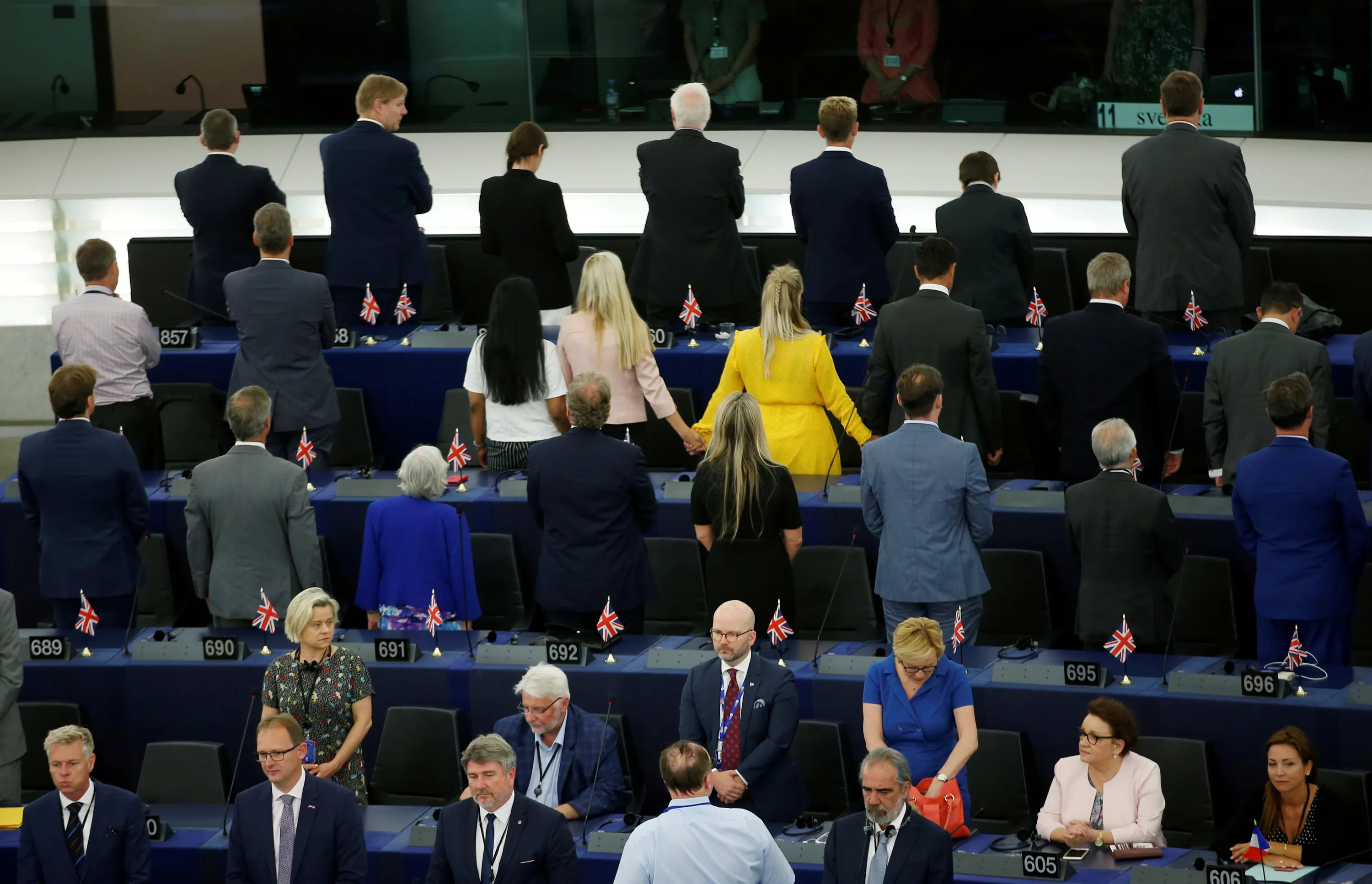 Members of the Brexit Party turn their back to the assembly as the European anthem is played, during the first plenary session of the newly elected European Parliament in Strasbourg, France, July 2, 2019. (Photo by Vincent Kessler/Reuters)