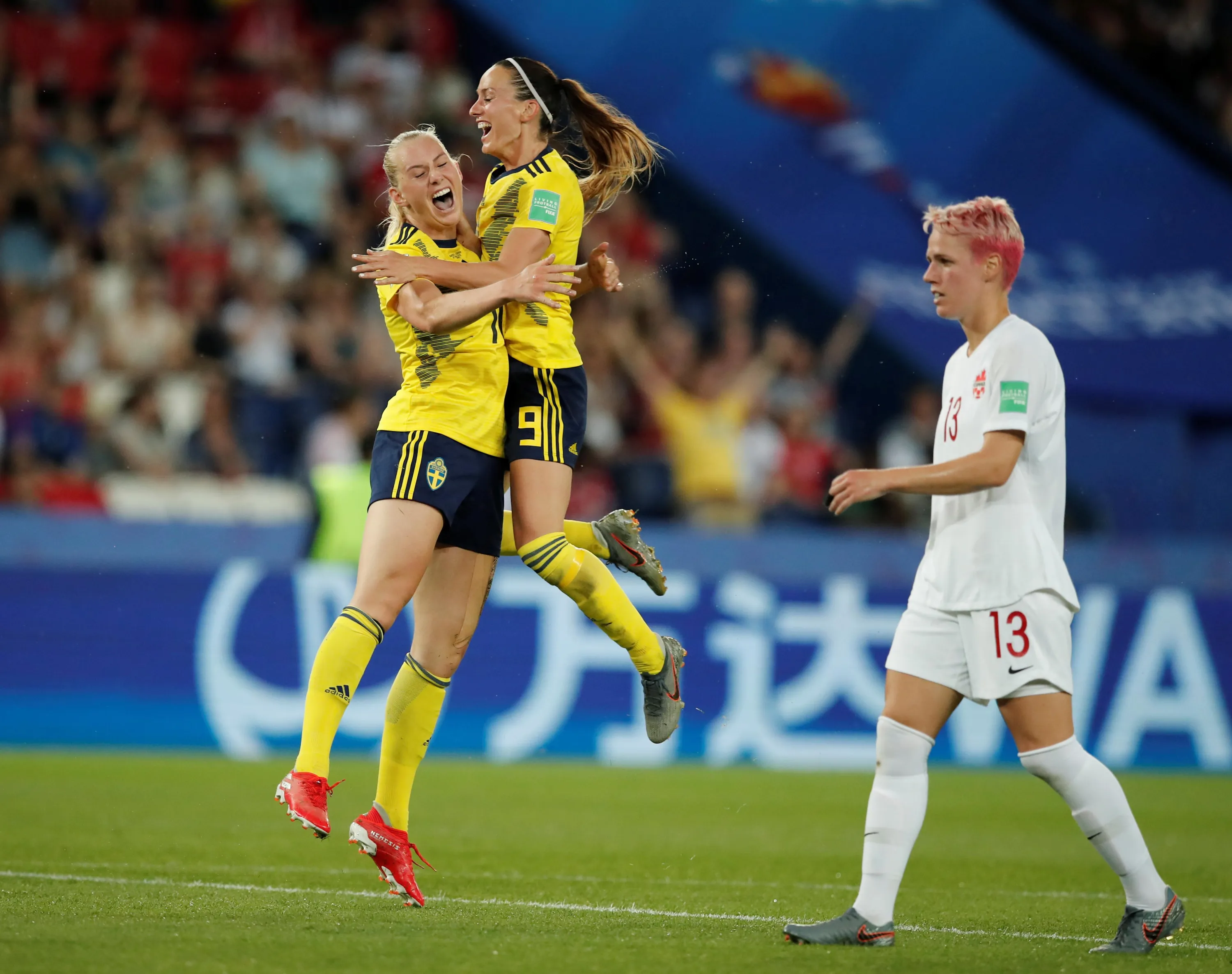 Sweden's Stina Blackstenius celebrates with Kosovare Asllani, right, after scoring the opening goal during the Women's World Cup round of 16 soccer match between Sweden and Canada at the Parc des Princes in Paris, France, Monday, June 24, 2019. (Photo by Benoit Tessier/Reuters)