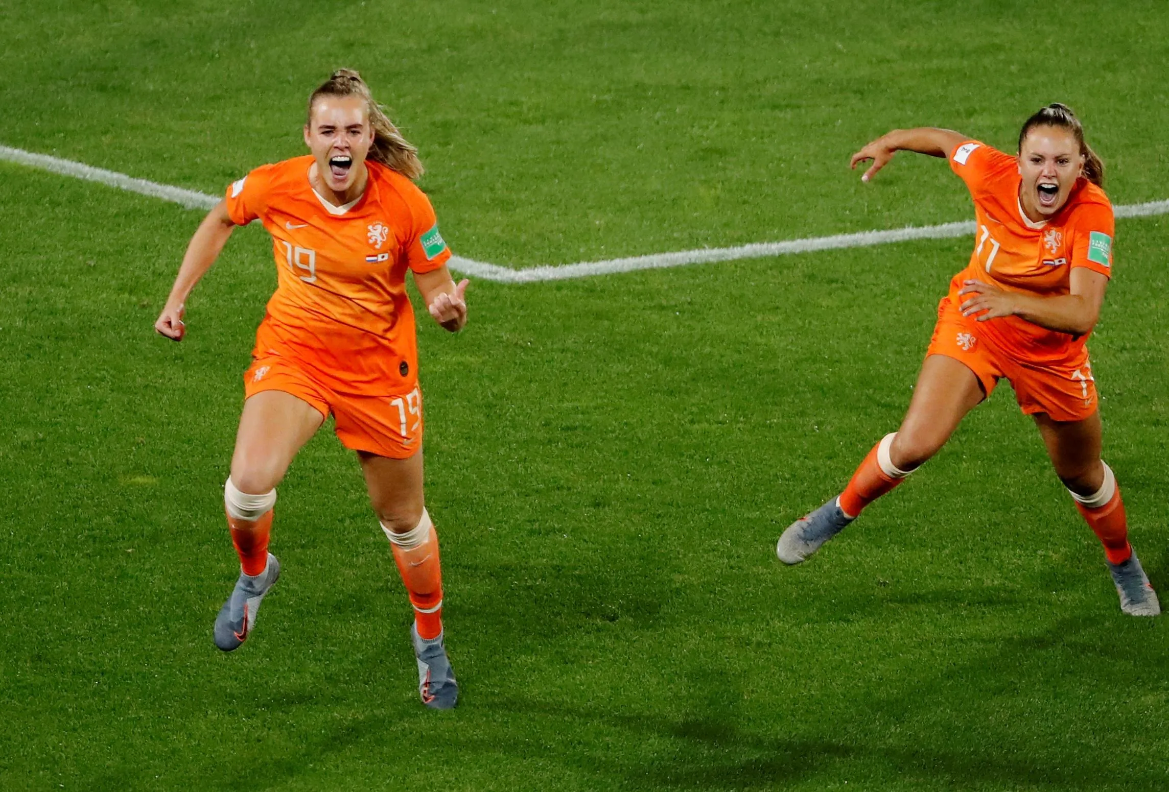 Jill Roord and Lieke Martens of Holland Women celebrate 2-1 during the World Cup Women match between Holland v Japan at the Stadion Roazhon Park on June 25, 2019 in Rennes, France. (Photo by Stephane Mahe/Reuters)