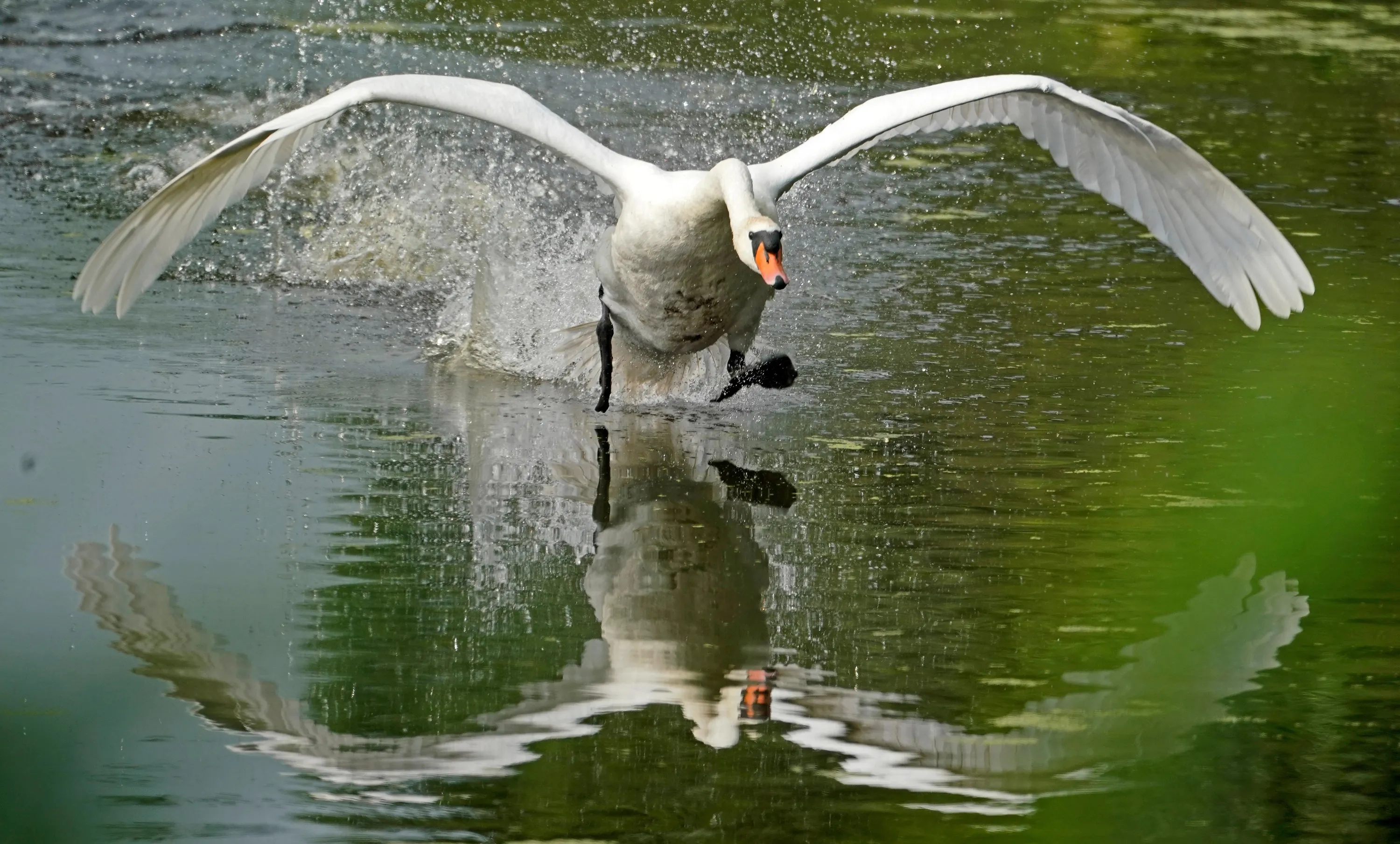 A mute swan (cygnus olor) flies on a pond at the nature reservation “Wagbachniederung” in Waghaeusel, near Karlsruhe, Germany, 01 July 2019. The Wagbachniederung is an important breeding and resting place for breeding birds in Europe, which are endangered by extinction, and is one of the most important bird protection areas in Germany. (Photo by Ronald Wittek/EPA/EFE/Rex Features/Shutterstock)