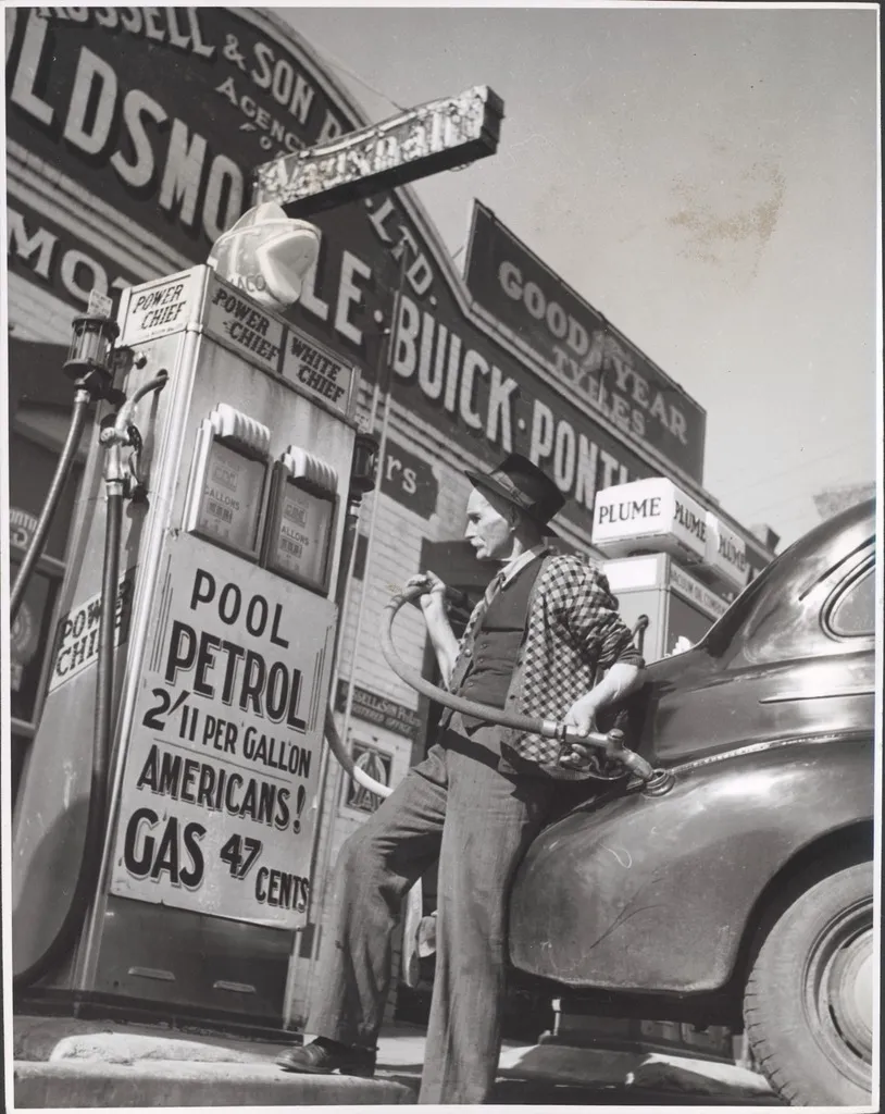 William Russell putting the four gallon monthly ration of petrol into a customer's car, Drouin, Victoria, ca. 1944. Home town Australia. Drouin's biggest service station (there are two) is owned by a company consisting of 80 year old William D. Russell and his family. Mr Russell is putting the four gallon monthly ration of gas onto a customers car