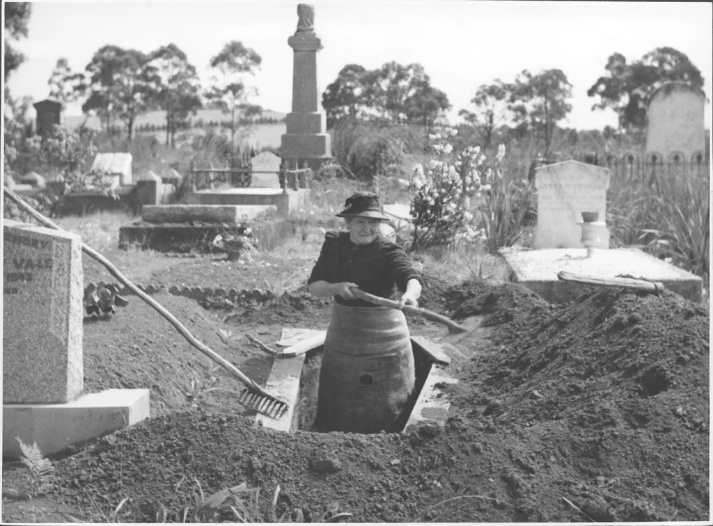 Josephine Smith digging a grave at the Drouin Cemetery, Victoria, ca. 1944. Meet Mrs. Josephine Smith, aged 84, whose hobby is digging graves. She lives in Drouin, a typical little farming town (1100 people), in southern Australia, 60 miles out of the Victorian capital, Melbourne