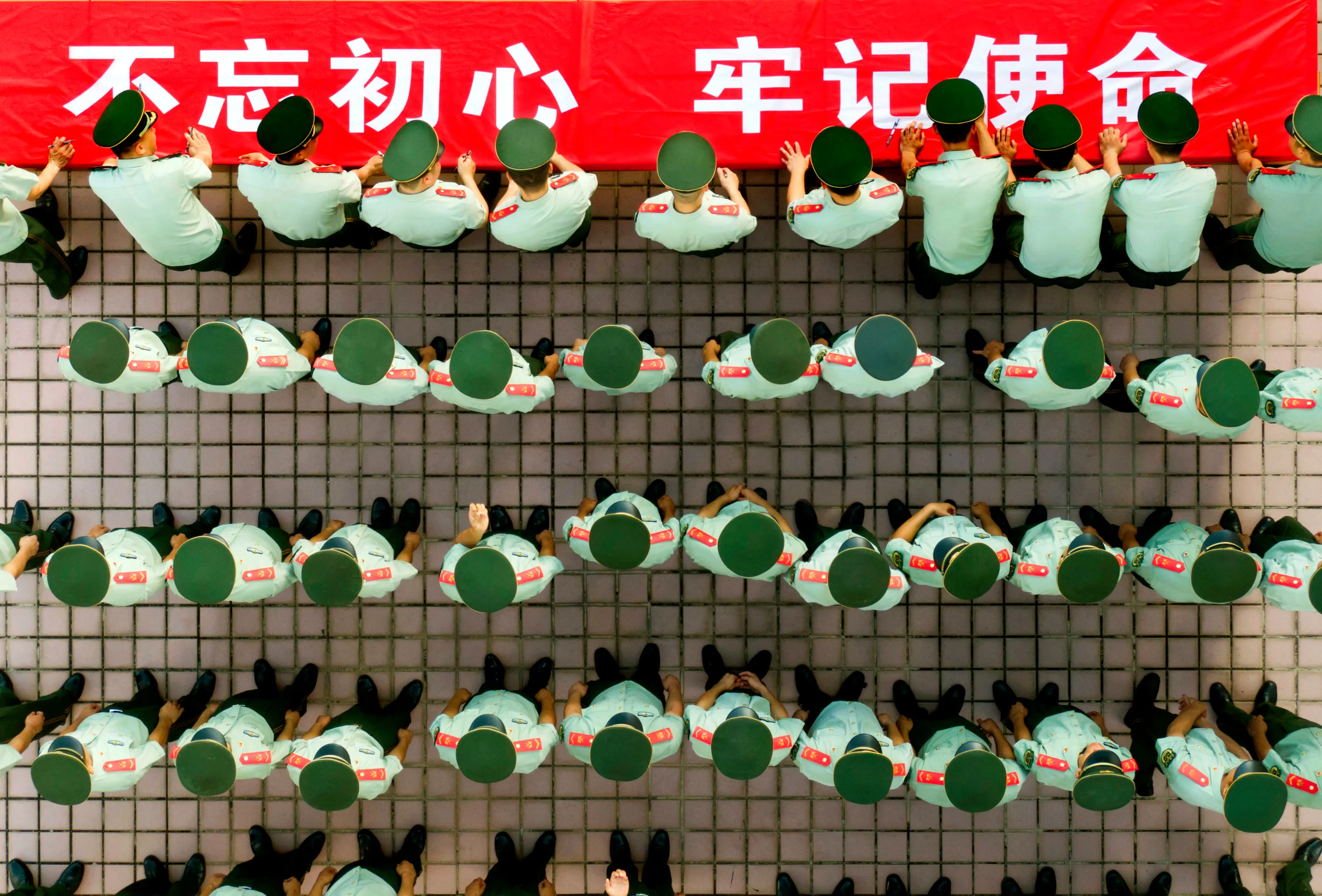 Members of the local paramilitary force sign their names on a banner marking the 98th anniversary of the Communist party in Shenzhen, China on June 30, 2019. (Photo by Feature China/Barcroft Media)