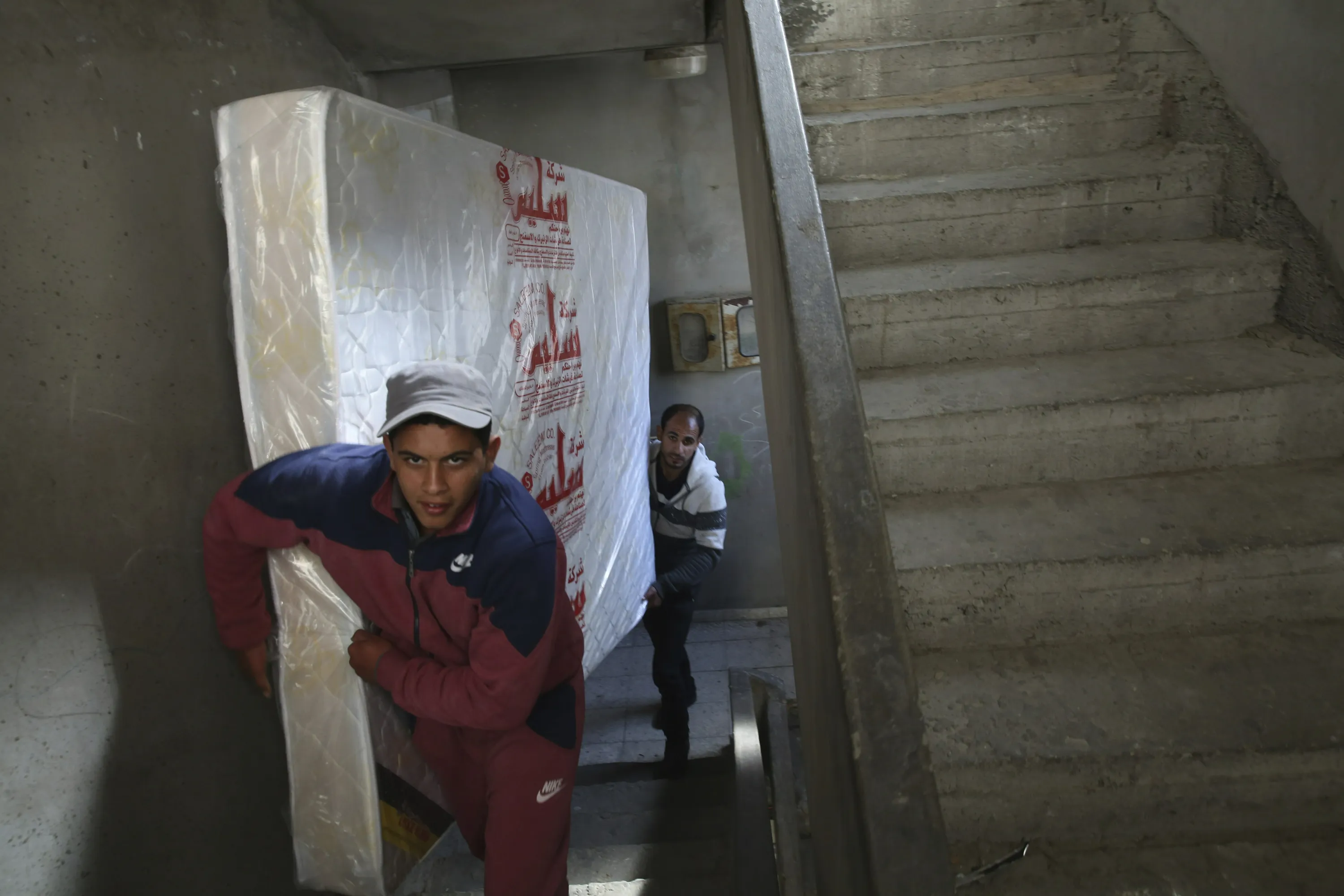 In this April 21, 2019 photo, Palestinian groom Yehiya Taleb, center, move a mattress, part of his wedding furniture, to his apartment in Shati refugee camp, Gaza City. Hundreds of young men in the Gaza Strip have turned to a small industry of lenders to help them pay for their weddings. Taleb got a job working as a waiter at a cafe earning about $180 a month, but that amount was not enough to cover wedding expenses so he took out a $2,000 package through the Farha Project, one of the wedding financing companies. (Photo by Adel Hana/AP Photo)