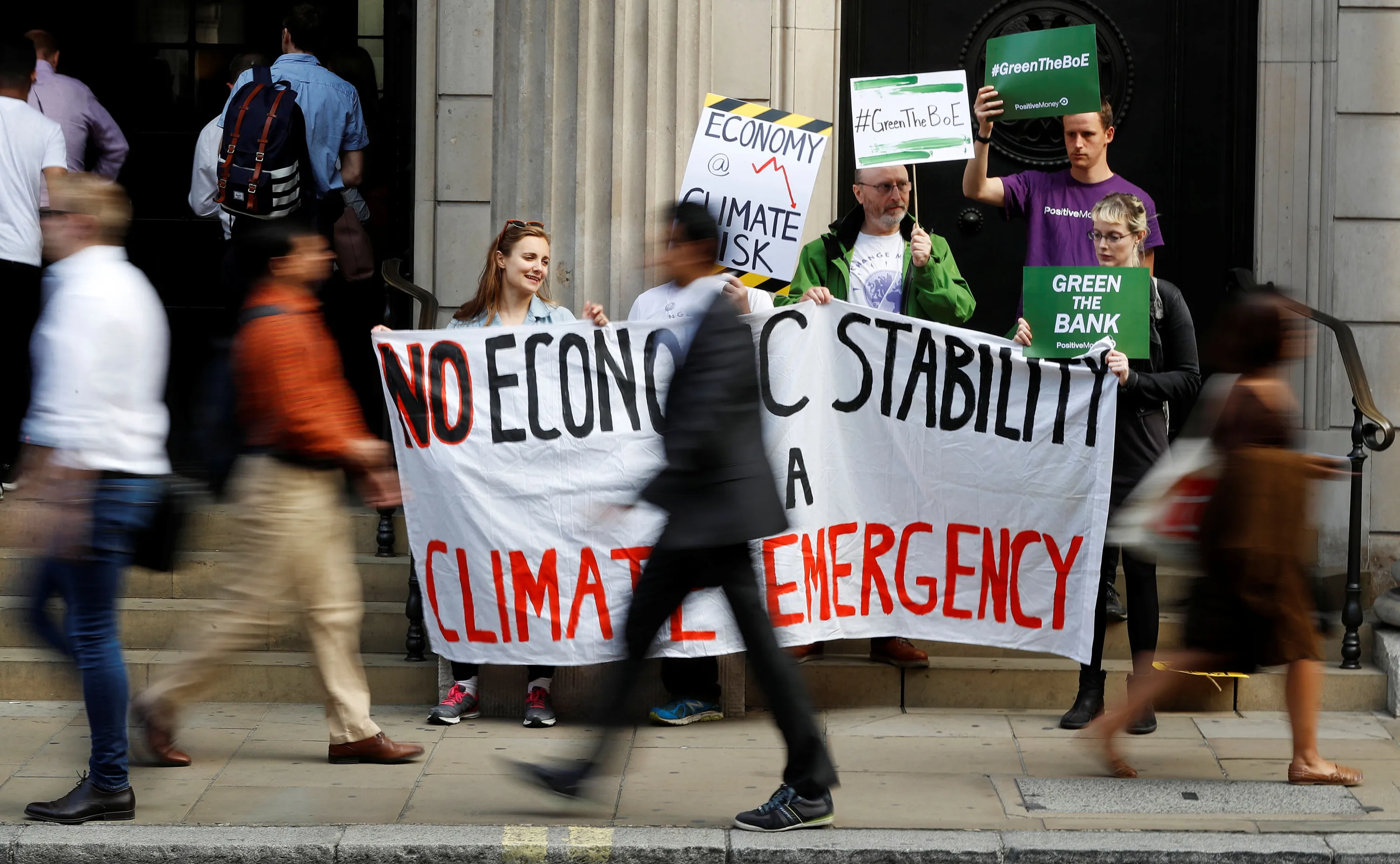 Environmental and banking system protestors demonstrate outside the Bank of England demanding that the bank rule out investment in high-carbon sectors in London, Britain July 11, 2019. (Photo by Peter Nicholls/Reuters)