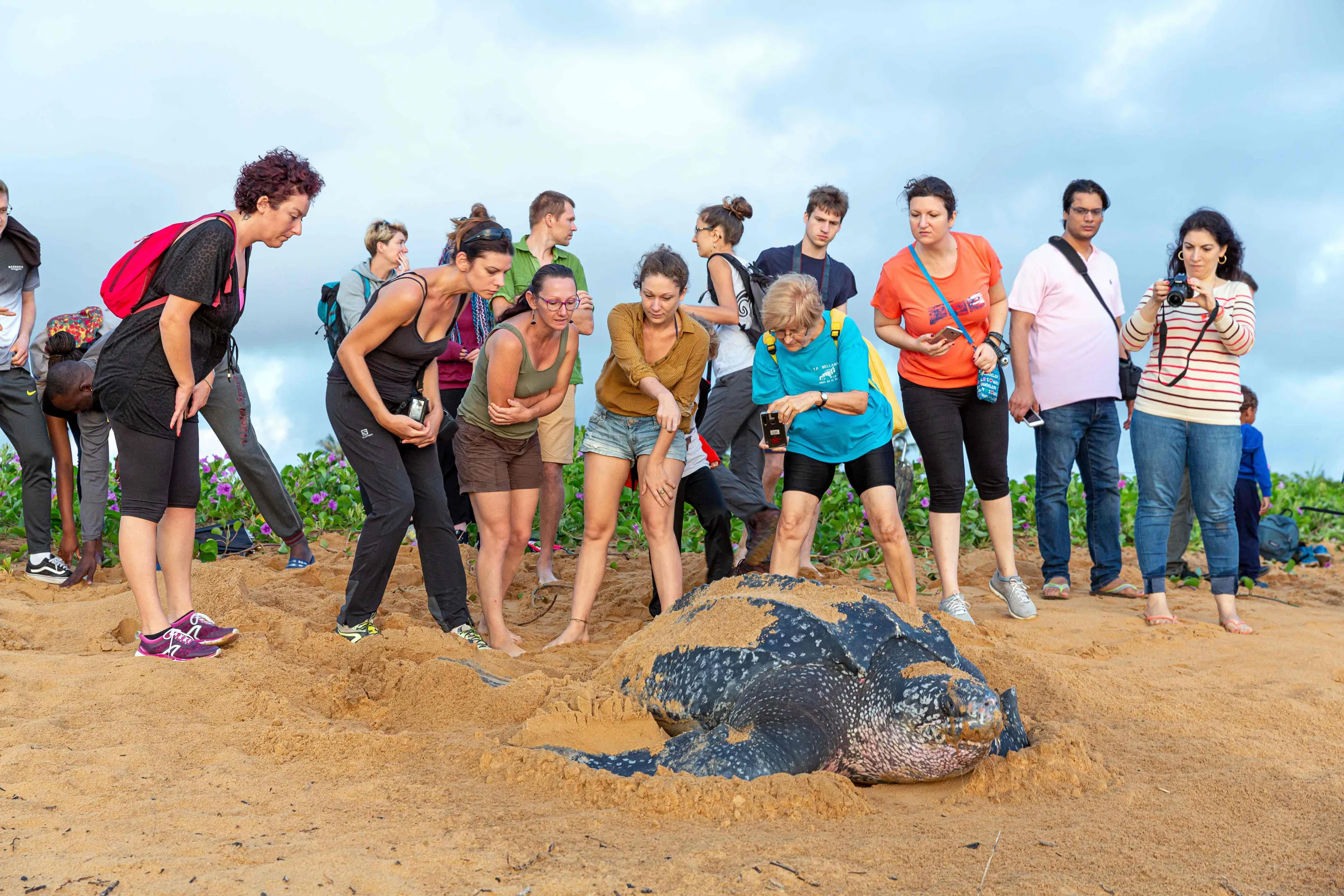Onlookers take pictures as they observe a leatherback sea turtle, also known as the Luth turtle, laying eggs under the supervision of Kwata association members on a beach in Remire-Montjoly, French Guiana, on July 4, 2019. (Photo by Jody Amiet/AFP Photo)