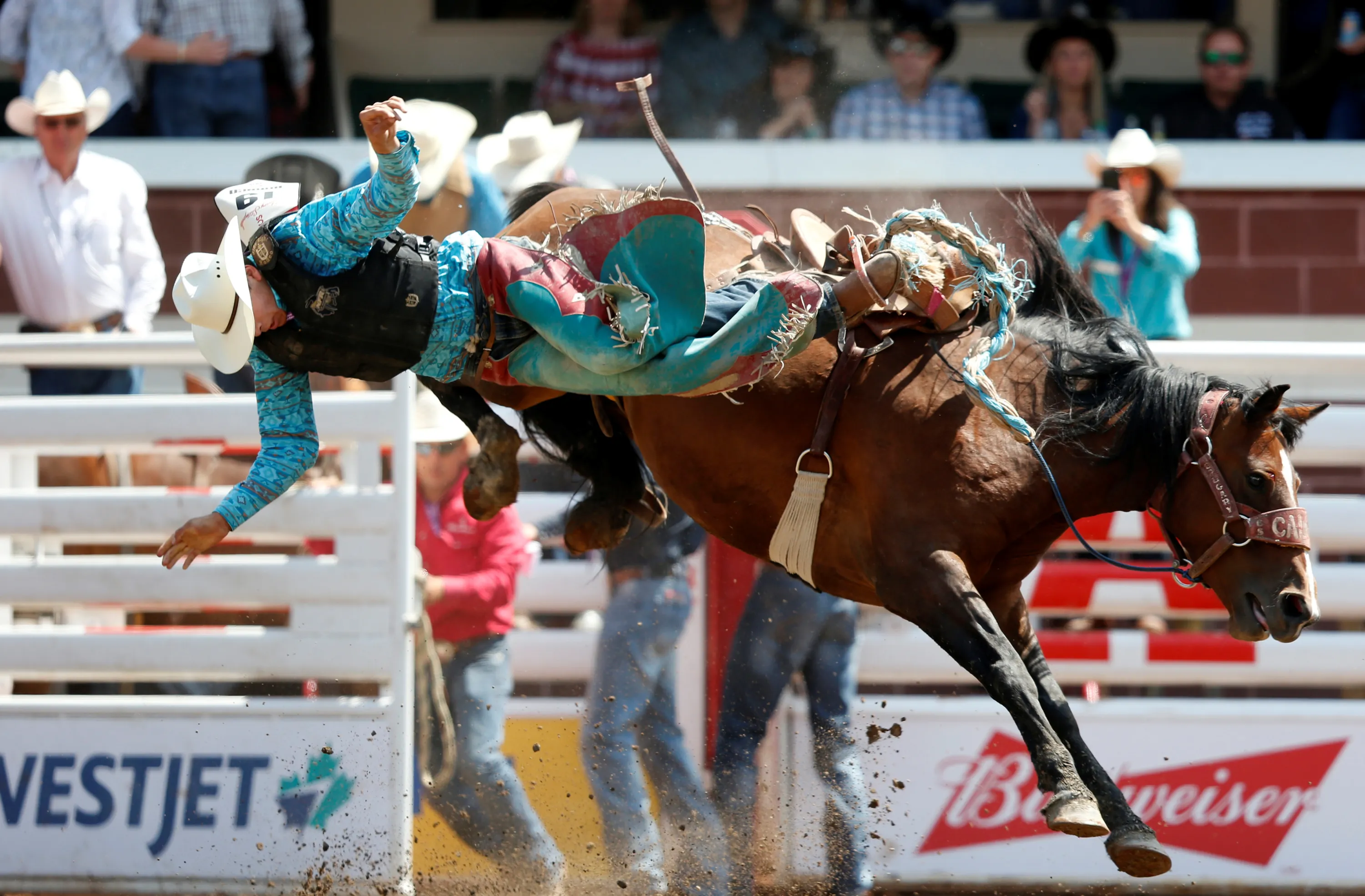 Kilby Kittson of Browning, Montana gets tossed off the horse Betrayed Cankaid in the junior saddle bronc event during the Calgary Stampede rodeo in Calgary, Alberta, Canada on July 7, 2019. (Photo by Todd Korol/Reuters)