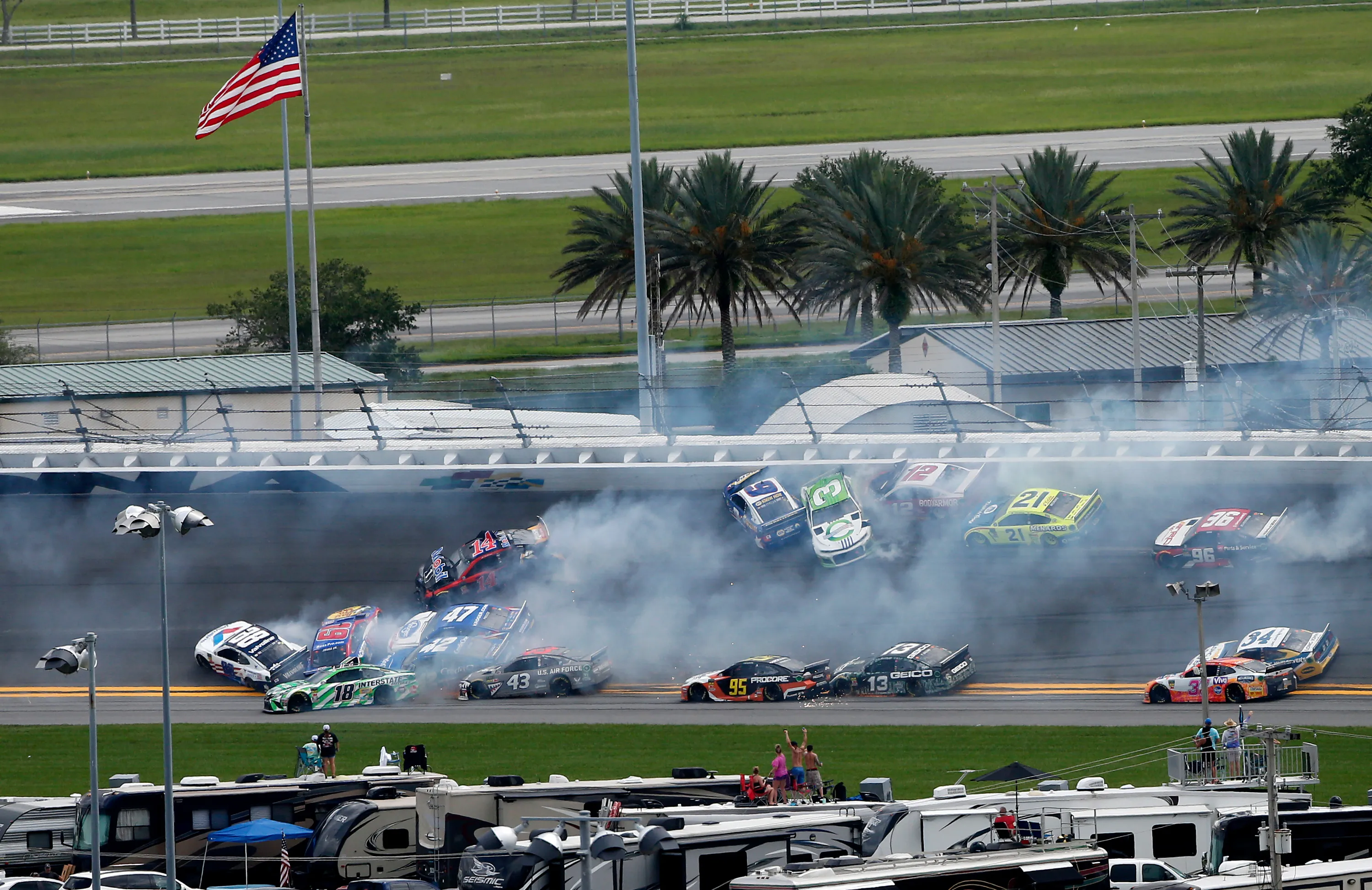 Austin Dillon, driver of the #3 American Ethanol Chevrolet, and Clint Bowyer, driver of the #14 Mobil 1/Rush Truck Centers Ford, start an on-track incident during the Monster Energy NASCAR Cup Series Coke Zero Sugar 400 at Daytona International Speedway on July 07, 2019 in Daytona Beach, Florida. (Photo by Brian Lawdermilk/Getty Images)