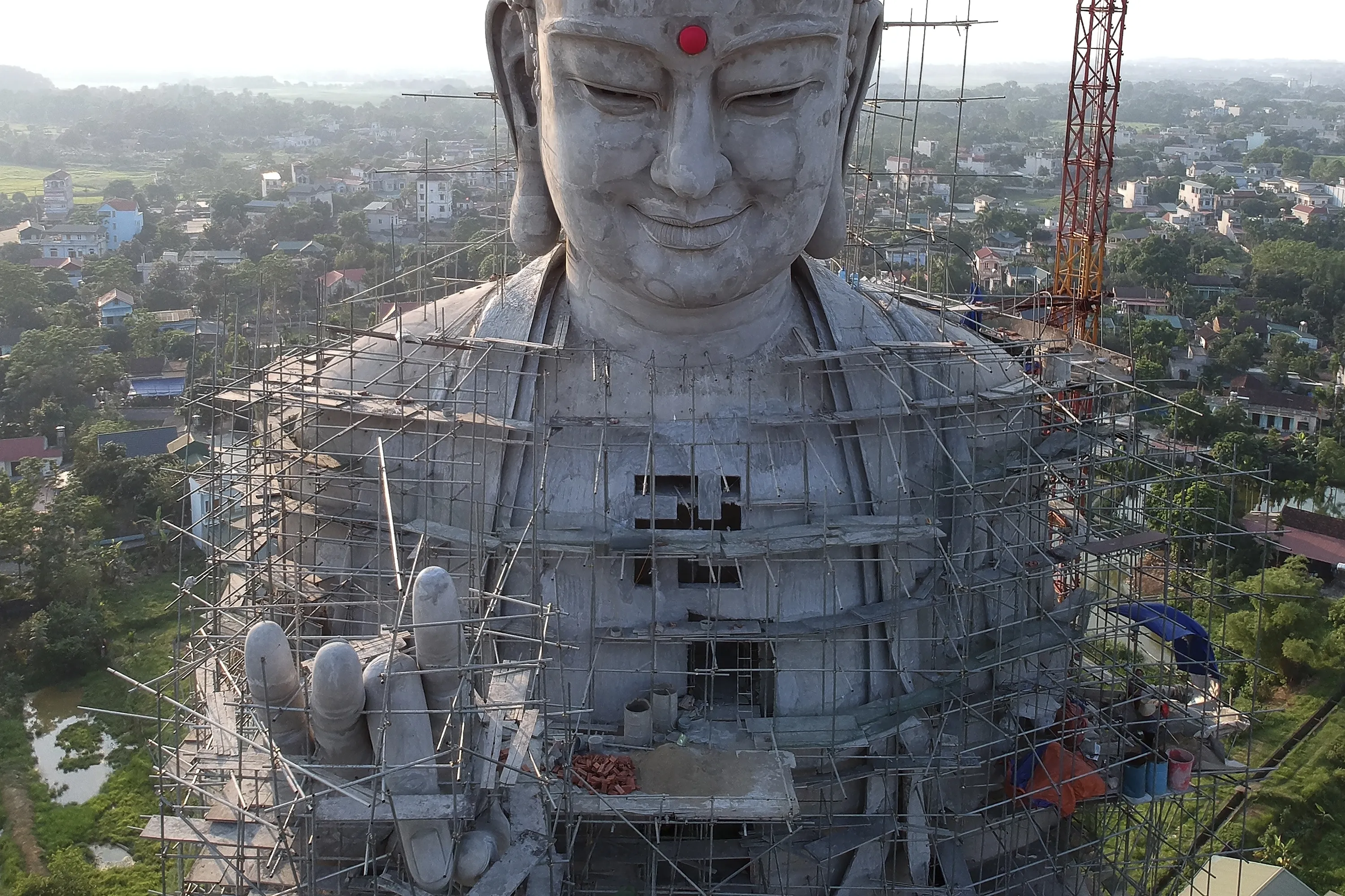 This aerial photograph shows a giant under-construction Buddha statue at Khai Nguyen pagoda in Son Tay on the outskirts of Hanoi on May 18, 2019 on the eve of Vesak day or Buddha day festival, marking the birth of Gautama Buddha, his attaining enlightenment, and his passing away. (Photo by Manan Vatsyayana/AFP Photo)