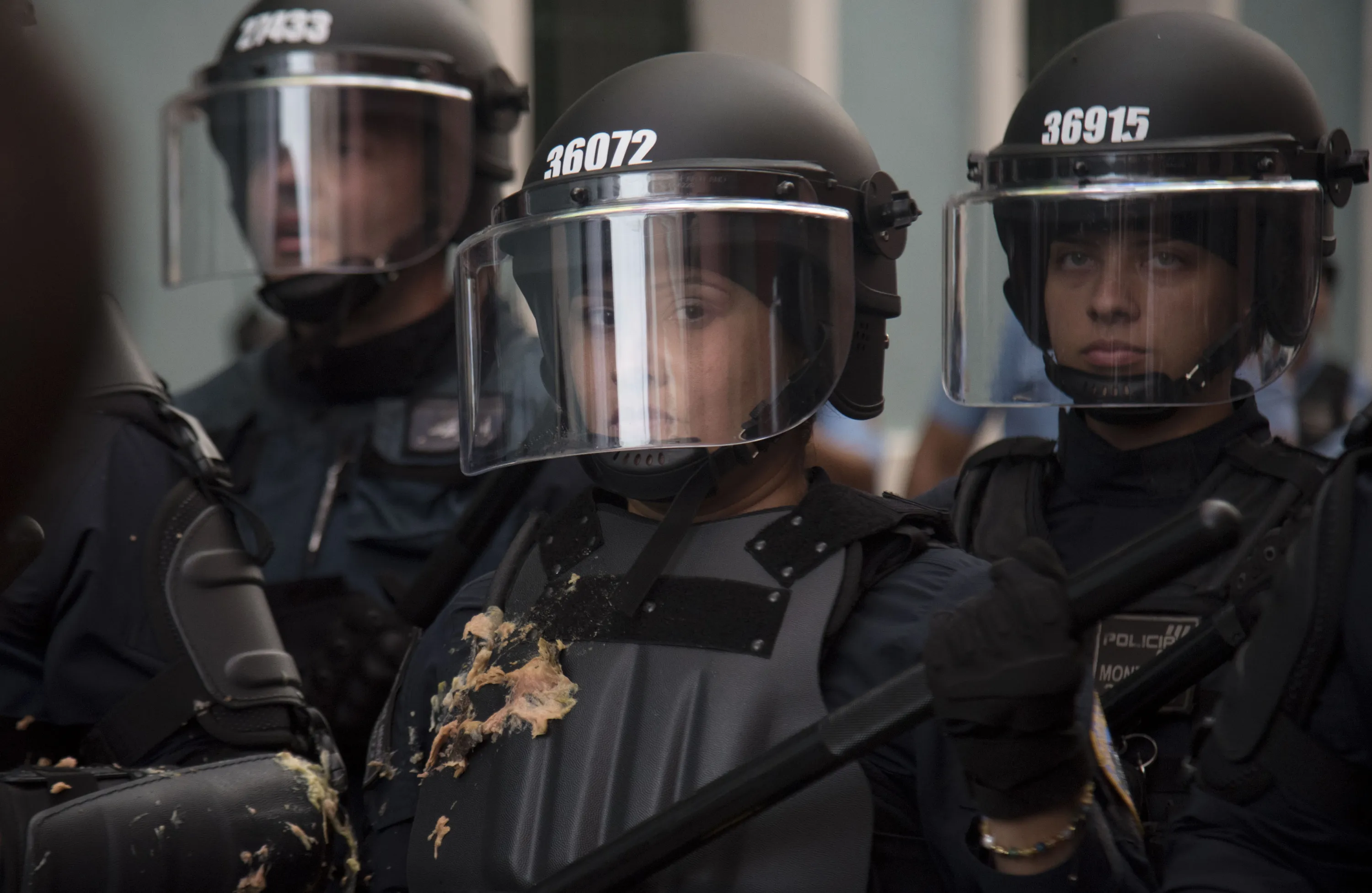 A police officer stands her ground after protesters threw food at officers, as police block them from reaching La Fortaleza governor's residence in San Juan, Puerto Rico, Sunday, July 14, 2019. (Photo by Carlos Giusti/AP Photo)
