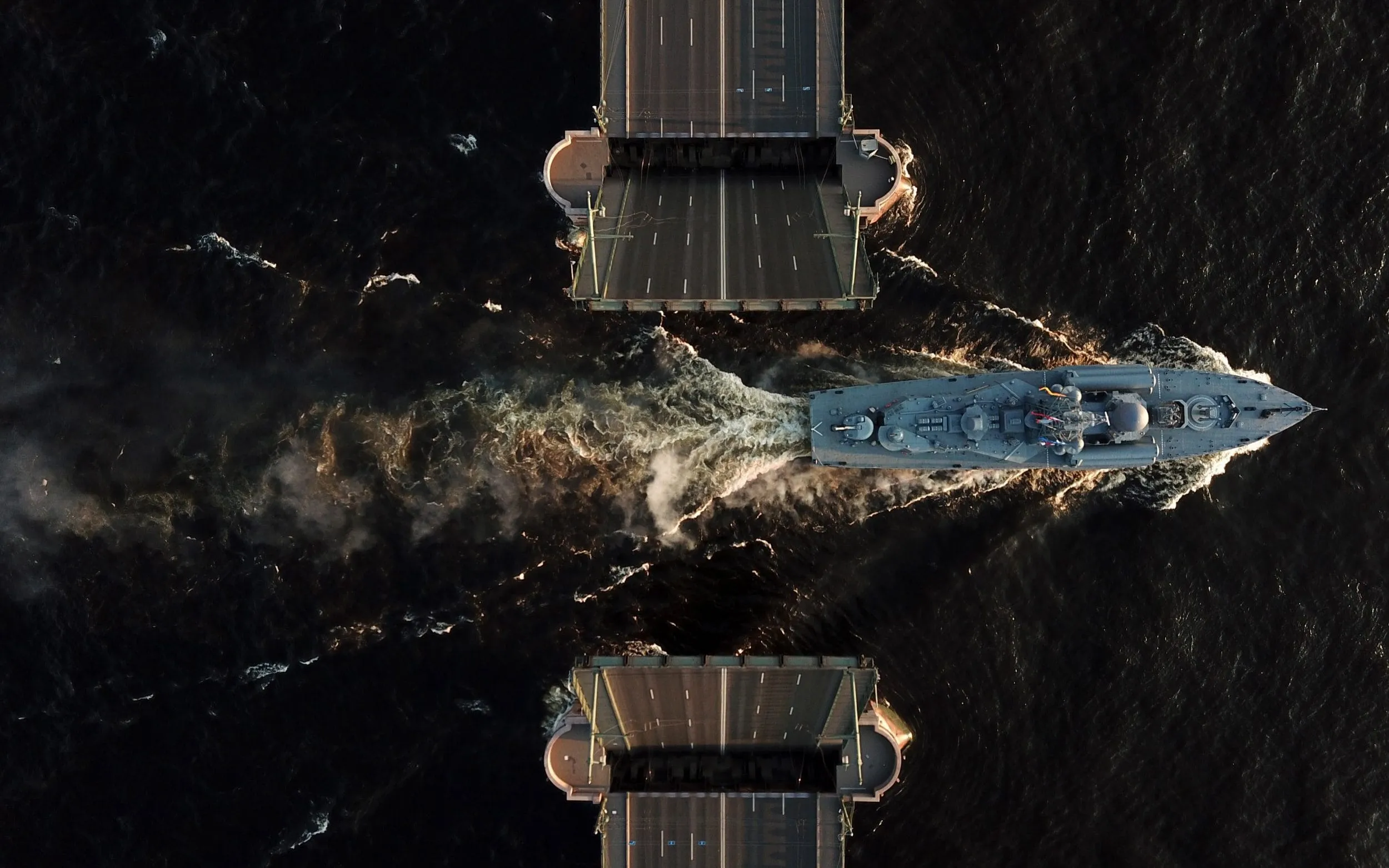 The Passat corvette goes past a drawbridge during a rehearsal for a Navy Day Parade on the Neva River in central St Petersburg on July 16, 2019. Russia celebrates Navy Day on the last Sunday of July. (Photo by Peter Kovalev/TASS)