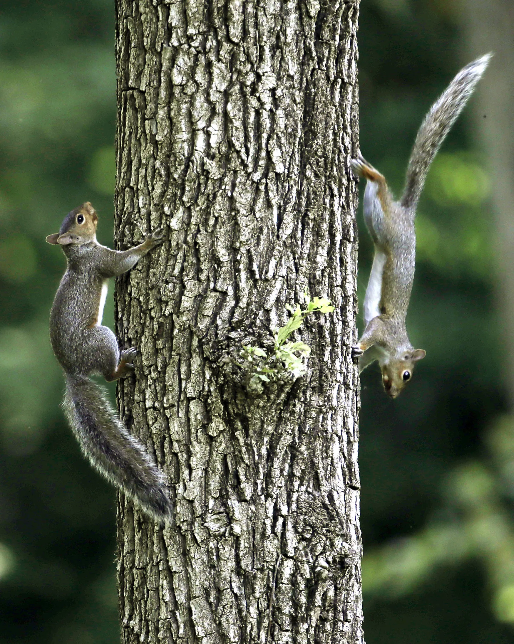 Two squirrels climb a tree at the Monza park, in Villasanta, near Milan, Italy, Thursday, July 18, 2019. (Photo by Luca Bruno/AP Photo)