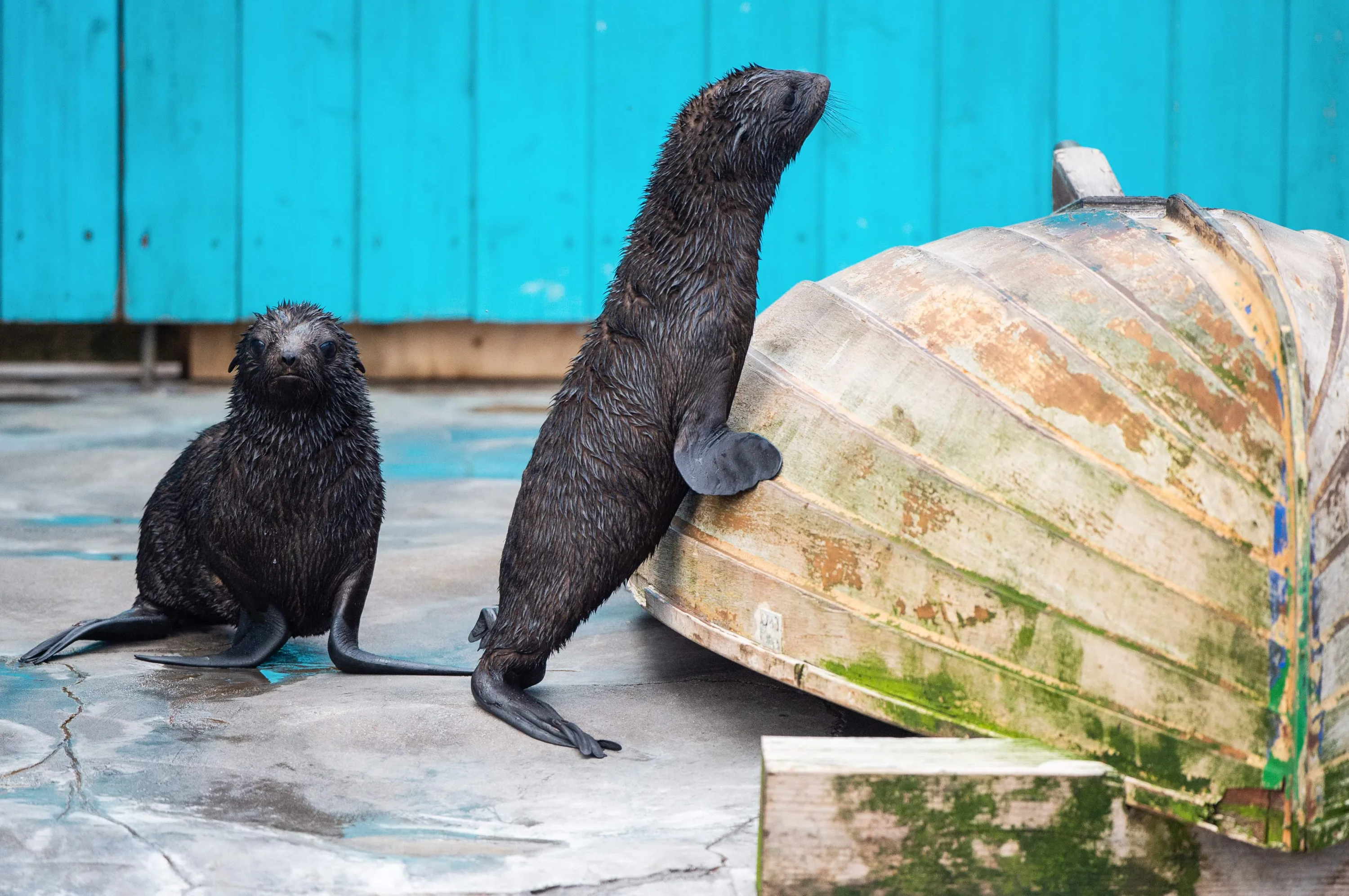 Northern sea bear calves dry off after a swim in their enclosure in Hanover, Germany on July 17, 2019. (Photo by Christophe Gateau/dpa)