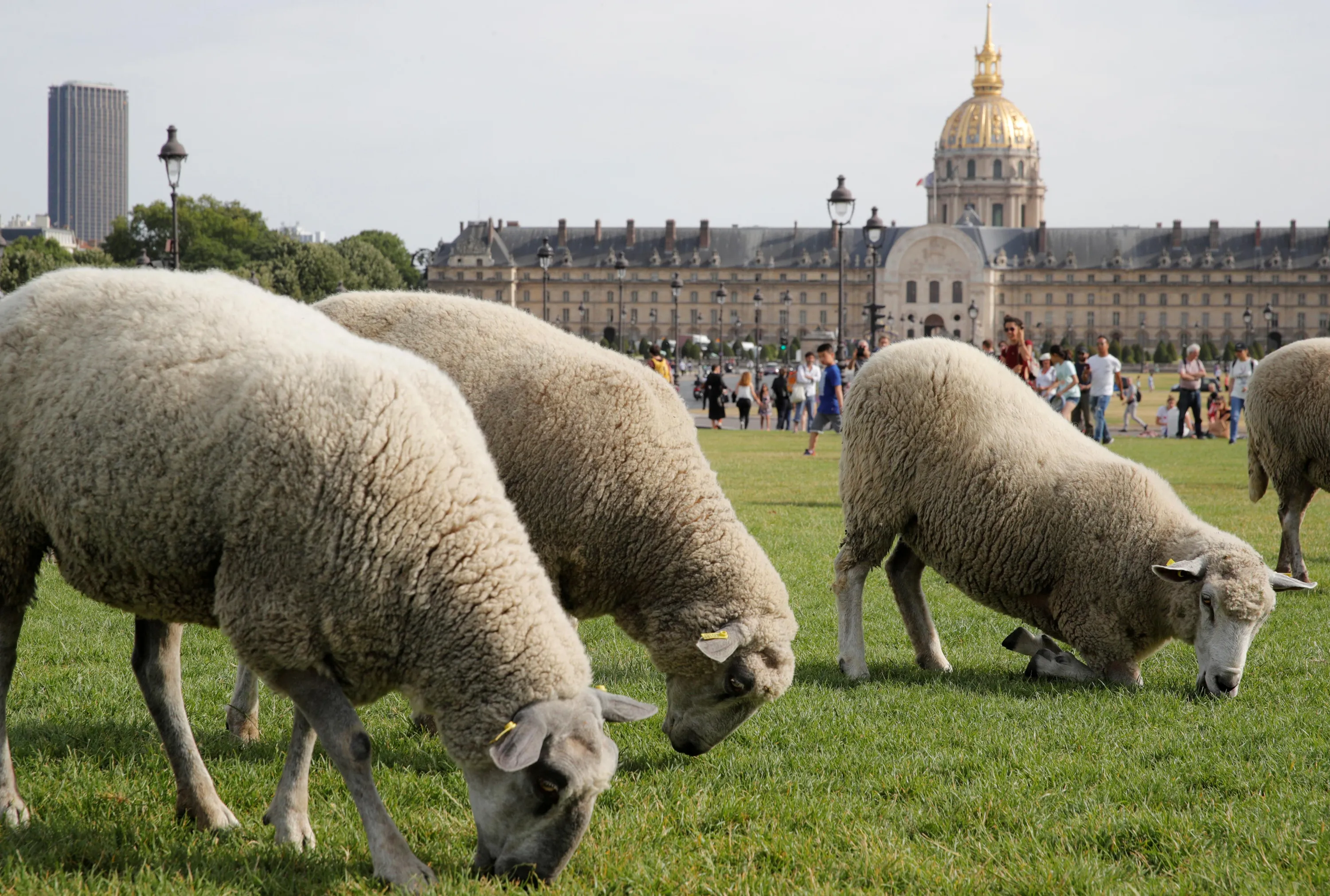 A flock of sheep graze near the Invalides during the last stage of the urban Transhumance of the Grand Paris (Greater Paris) in Paris, France, July 17, 2019. (Photo by Philippe Wojazer/Reuters)