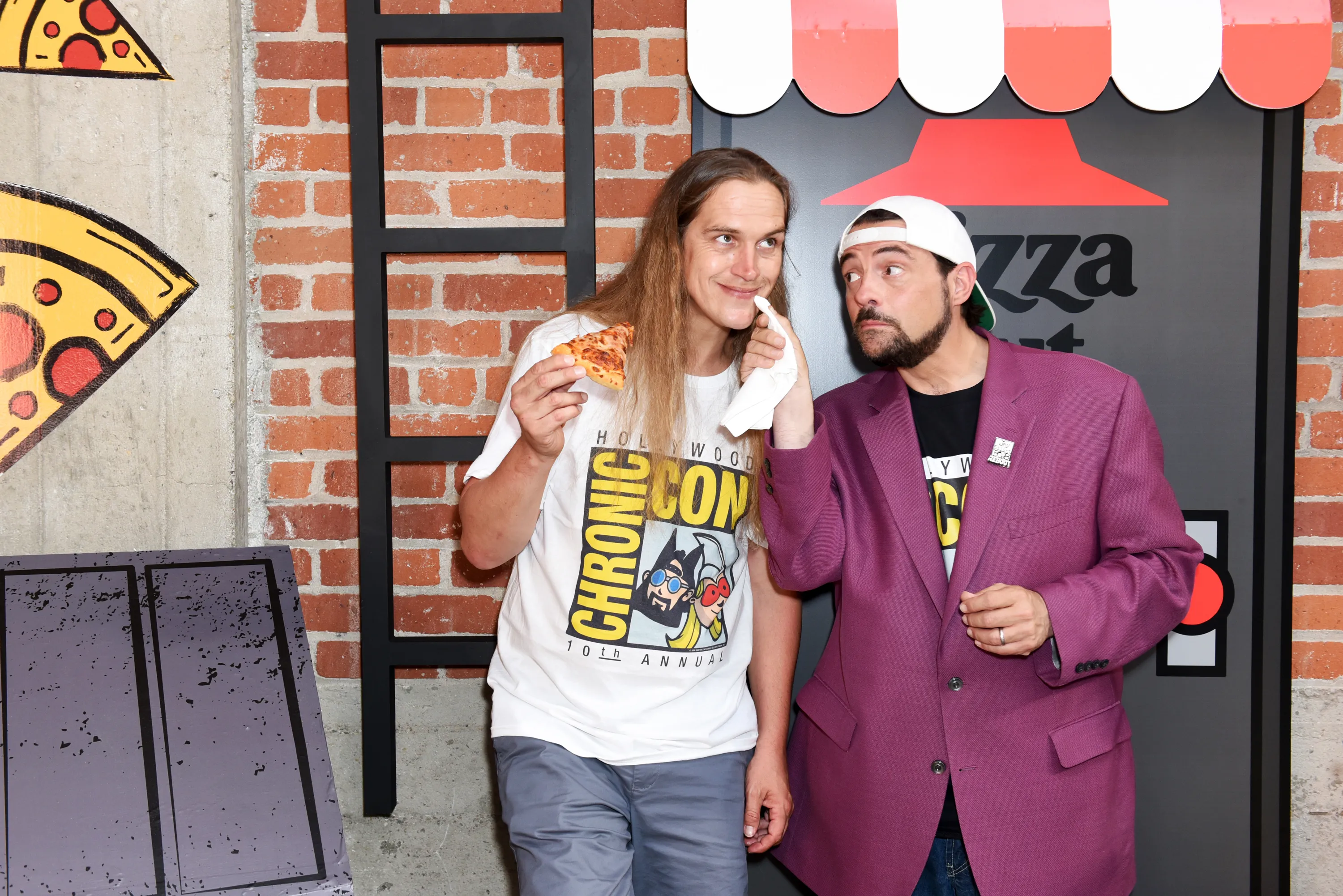 (L-R) Jason Mewes and Kevin Smith of “Jay and Silent Bob” attend the Pizza Hut Lounge at 2019 Comic-Con International: San Diego on July 18, 2019 in San Diego, California. (Photo by Presley Ann/Getty Images for Pizza Hut)