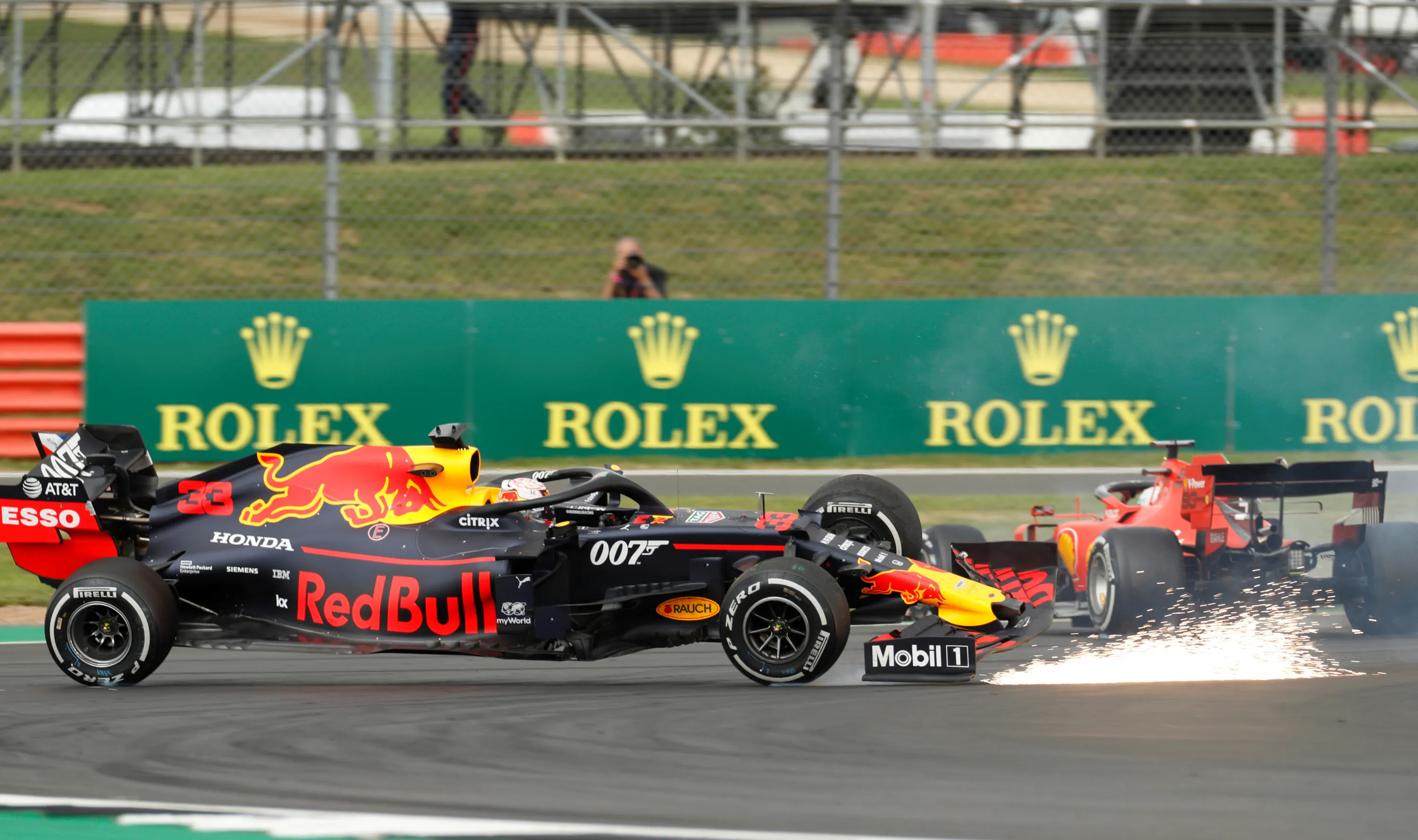 Max Verstappen of the Netherlands driving the (33) Aston Martin Red Bull Racing RB15 and Sebastian Vettel of Germany driving the (5) Scuderia Ferrari SF90 crash during the F1 Grand Prix of Great Britain at Silverstone on July 14, 2019 in Northampton, England. (Photo by John Sibley/Reuters)
