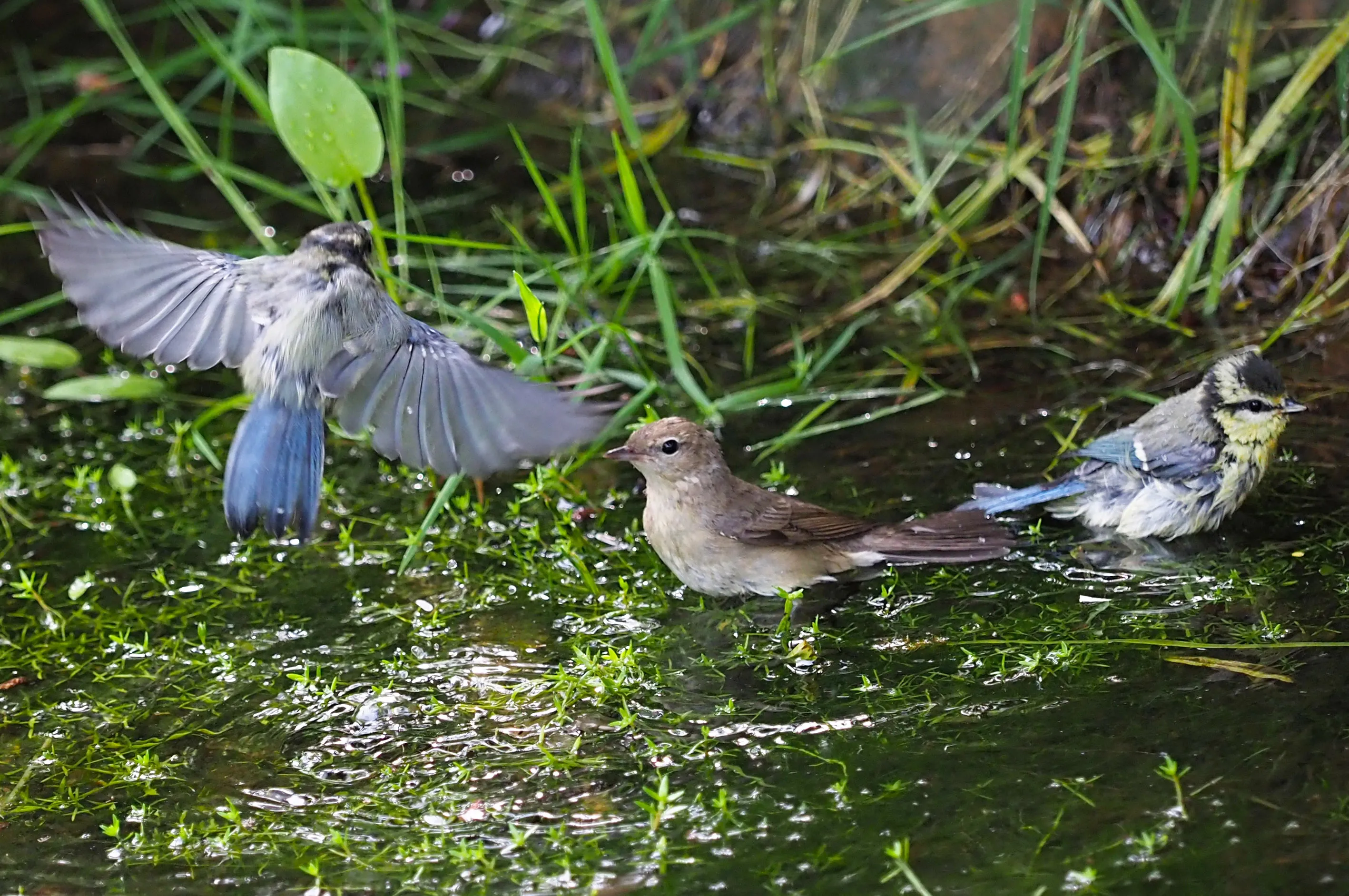 A nightingale shares the water with blue tits at the Nipponzan Myohoji Buddhist temple in Milton Keynes, England. The WWF and iNaturalist are launching Seek, an app designed to encourage get children outside and discovering local biodiversity. The launch comes at a time where more than 1m plant and animal species are at risk of extinction, according to a UN report. (Photo by Tony Margiocchi/Barcroft Media)
