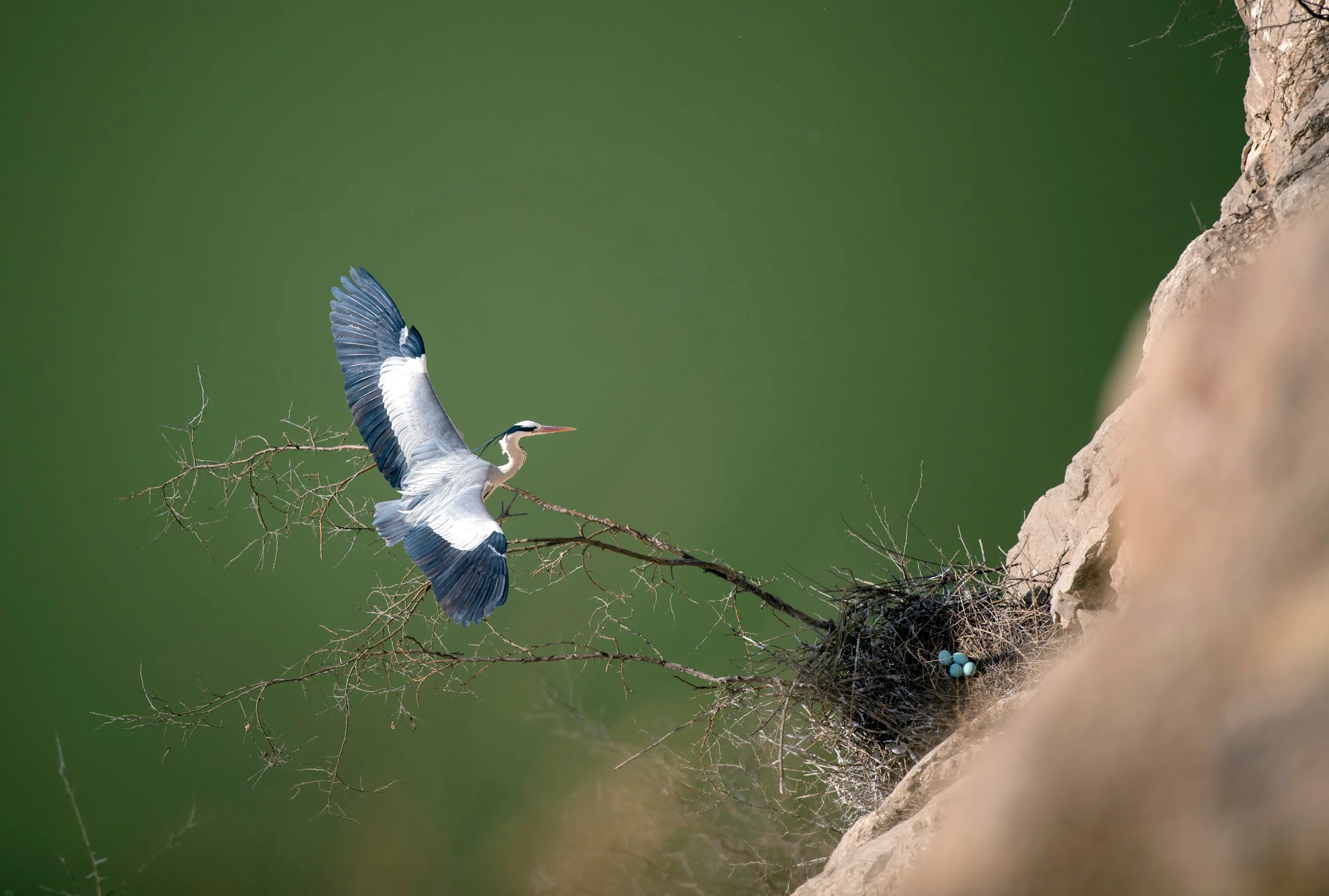 A heron near a nest in Pinglu County, north China’s Shanxi Province. As the weather turns warm, hundreds of herons build nests and reproduce here in springtime. (Photo by Liu Wenli/Xinhua News Agency/Barcroft Images)