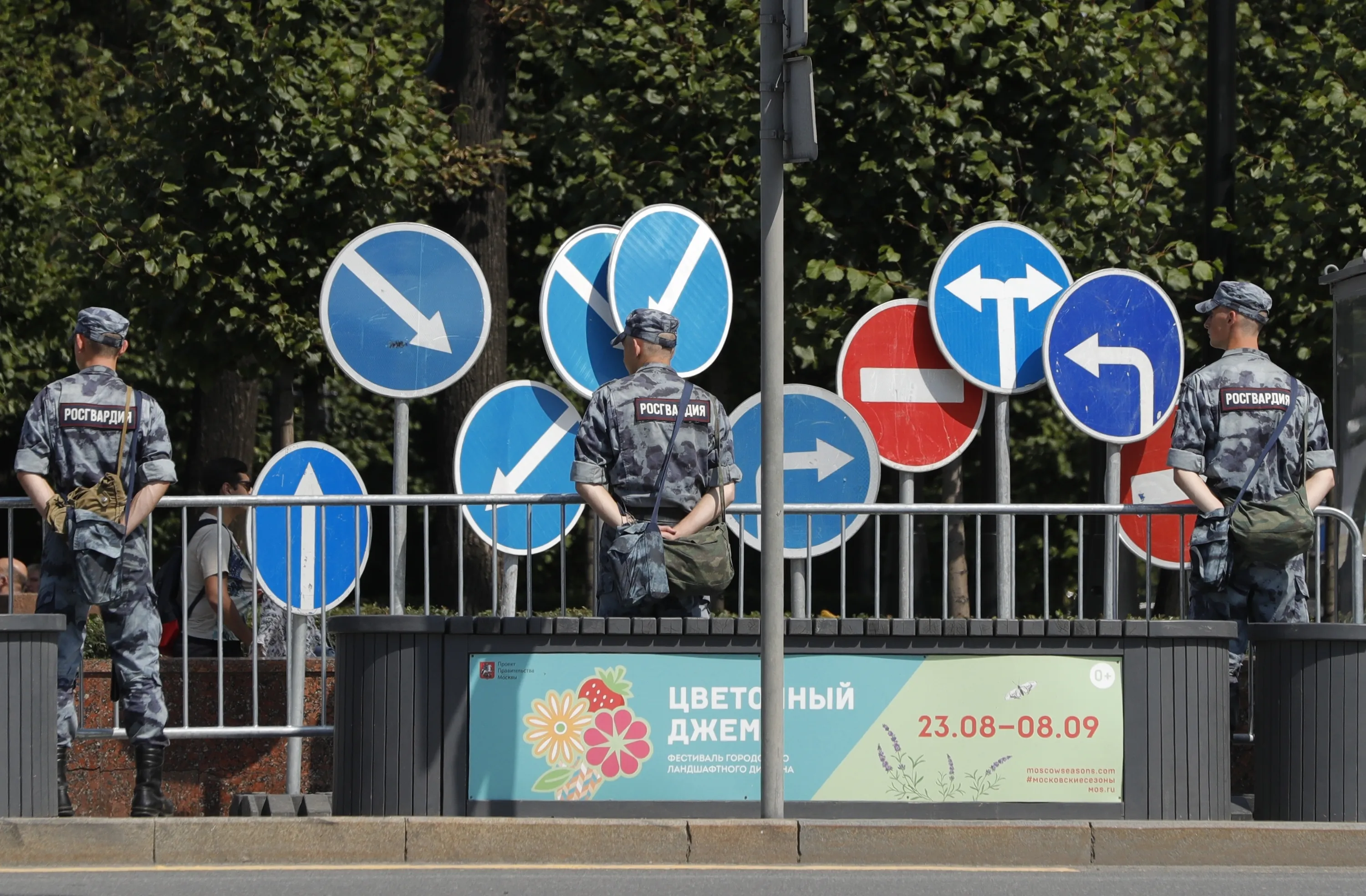 Rosguardia (National Guard) soldiers block a street prior to an unsanctioned rally in the center of Moscow, Russia, Saturday, July 27, 2019. (Photo by Pavel Golovkin/AP Photo)