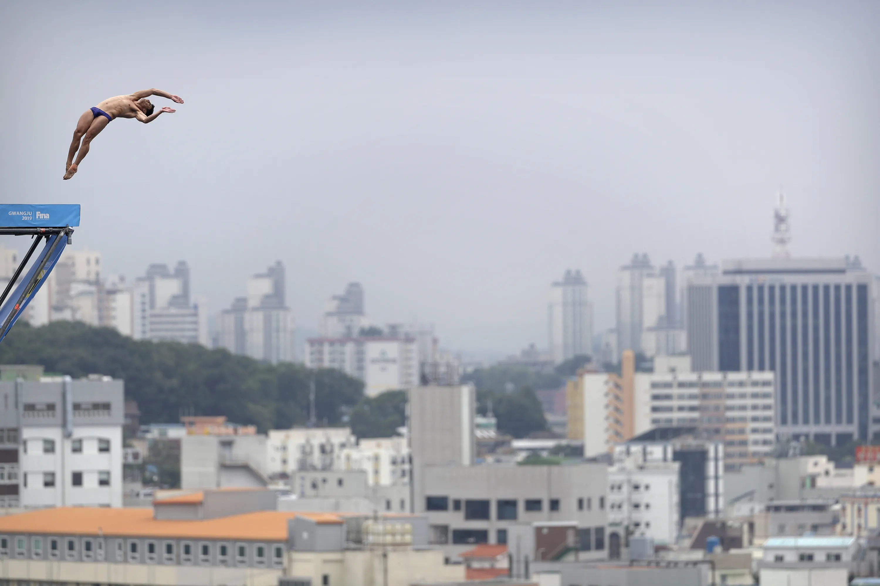 Jonathan Paredes of Mexico dives during the men's high diving competition at the World Swimming Championships in Gwangju, South Korea, Wednesday, July 24, 2019. (Photo by Mark Schiefelbein/AP Photo)