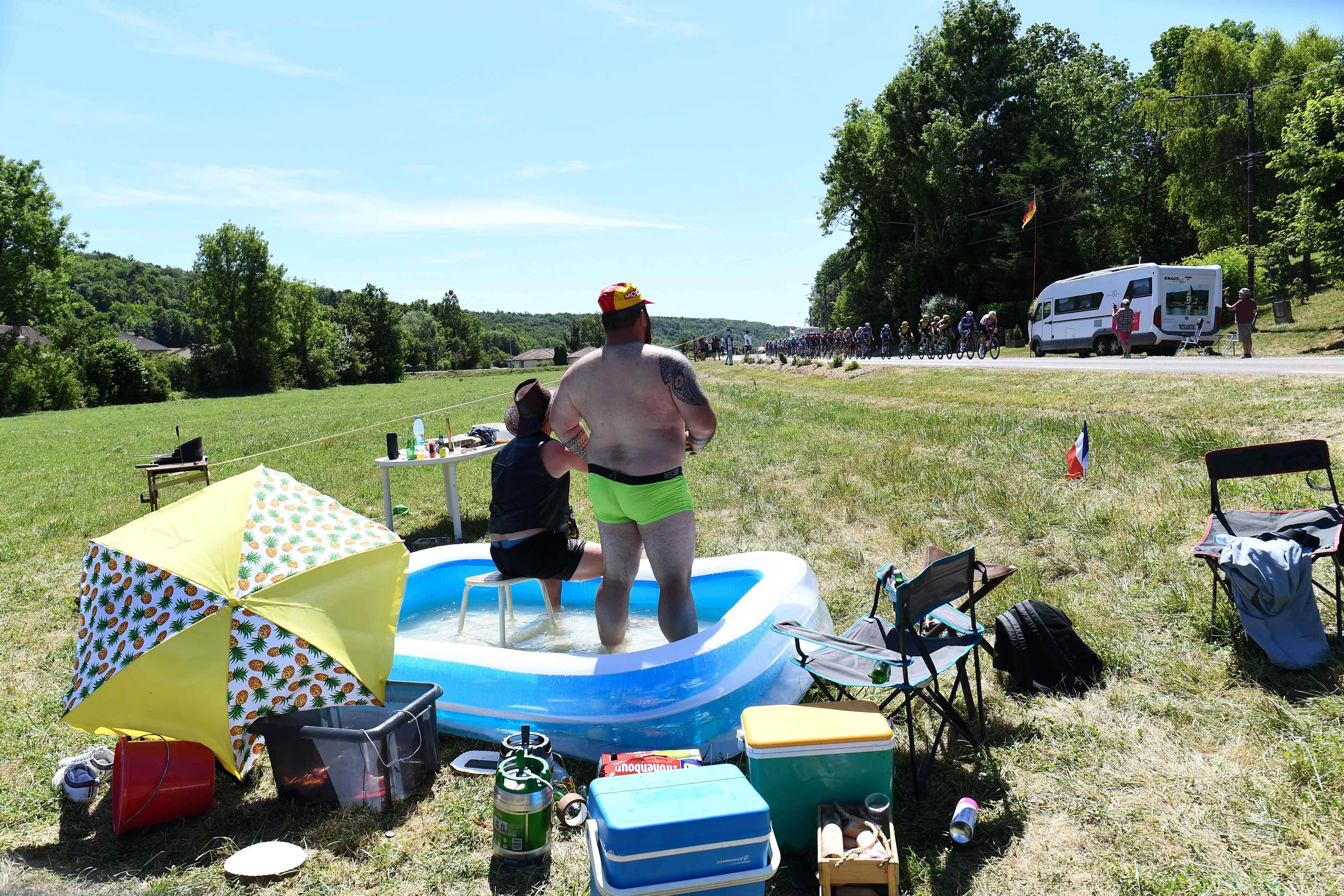 In this file photo taken on July 09, 2019 Spectators refresh themselves in a swimming pool as they watch cyclists riding during the fourth stage of the 106th edition of the Tour de France cycling race between Reims and Nancy, eastern France. (Photo by Anne-Christine Poujoulat/AFP Photo)