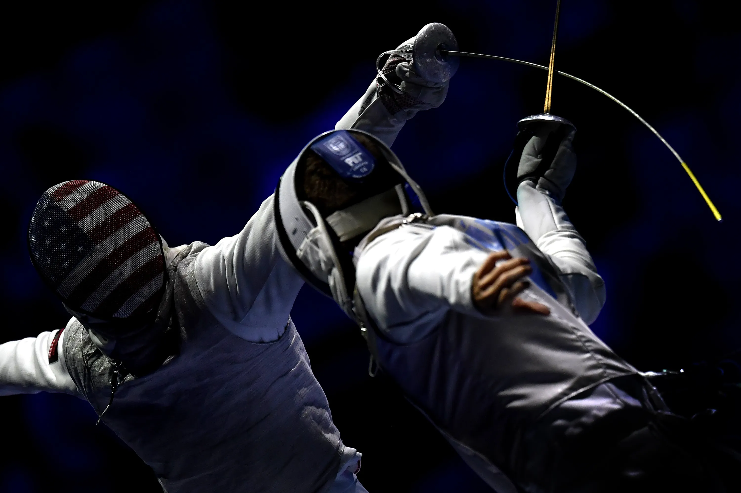 Tamas Meszaros, right, of Hungary and Race Imboden of United States fence during the men's team foil round of 16 match of the FIE World Fencing Championships in Budapest, Hungary, Monday, July 22, 2019. (Photo by Tibor Illyes/MTI via AP Photo)