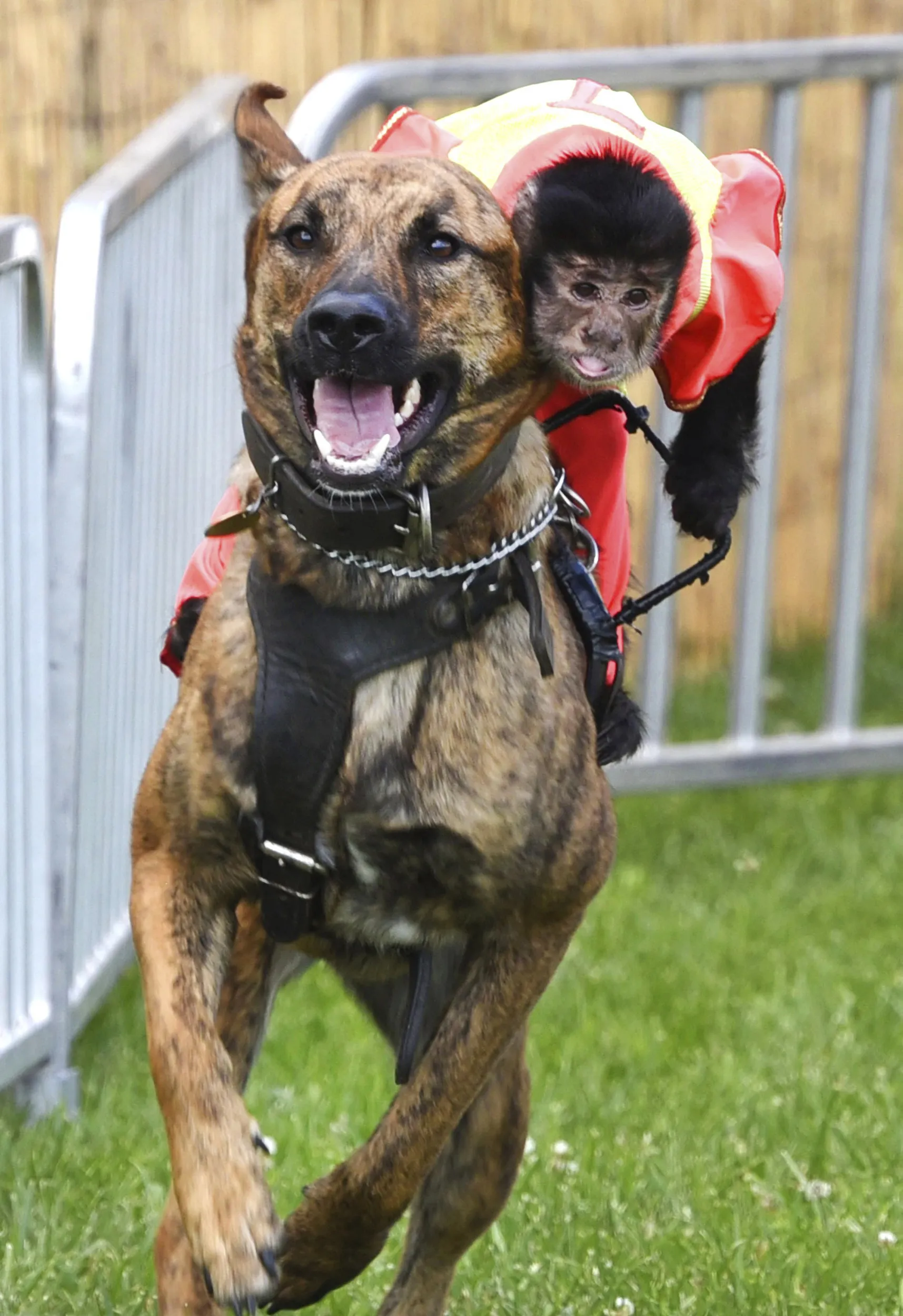 Bert, a black-capped Capuchin monkey, leans into the coming turn as he rides Luna, a German shepherd in the Banana Derby during the McHenry County Fair in Woodstock, Ill., Tuesday, July 30, 2019. (Photo by John Starks/Daily Herald via AP Photo)