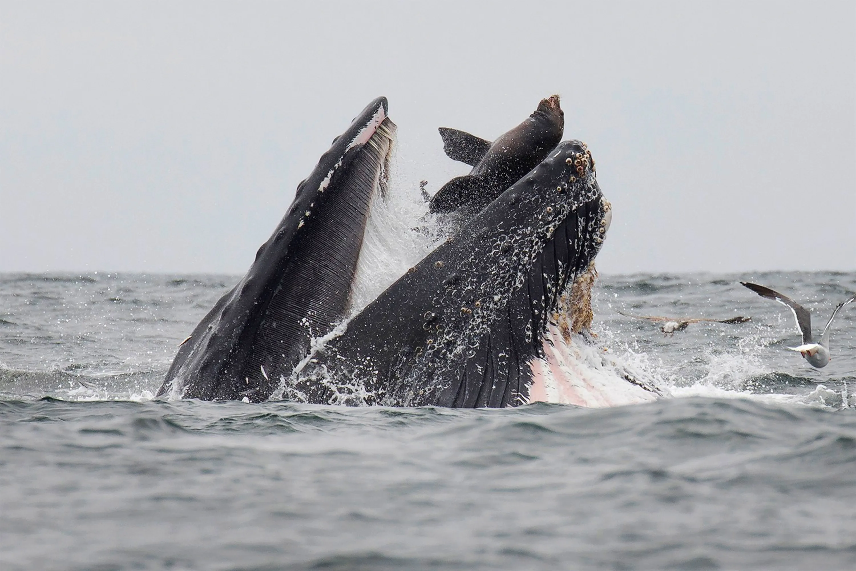 This handout picture released on July 30, 2019, shows a sea lion accidentally caught in the mouth of a humpback whale in Monterey Bay, California. In a stunning photo, a wildlife photographer has captured a sea lion falling into the mouth of a humpback whale in what he calls a “once-in-a-lifetime” moment. (Photo by Chase Dekker/AFP Photo)