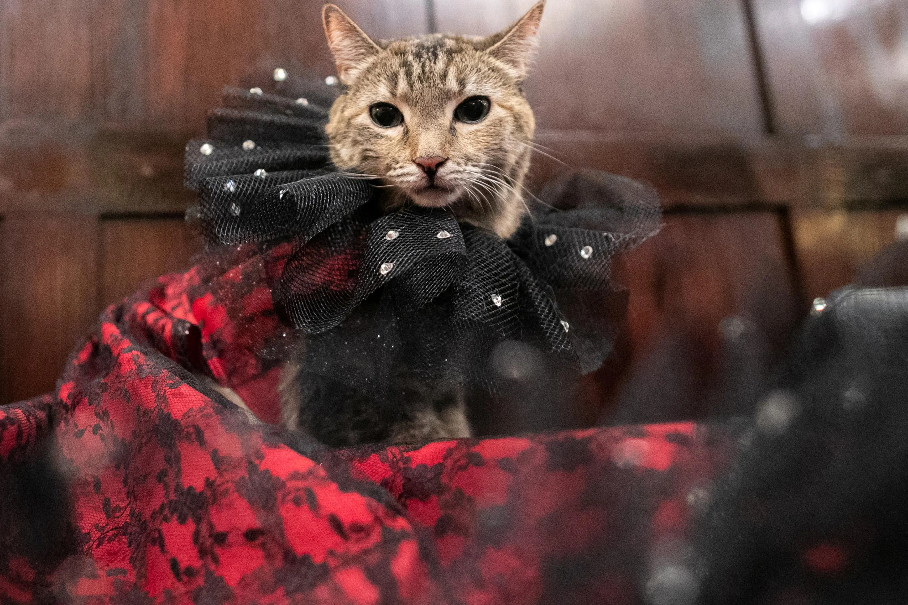Mrs.Parberry, dressed inspired by the flamenco dress, is seen at backstage before the Algonquin Hotel’s Annual Cat Fashion Show in the Manhattan borough of New York City, New York, U.S., August 1, 2019. (Photo by Jeenah Moon/Reuters)