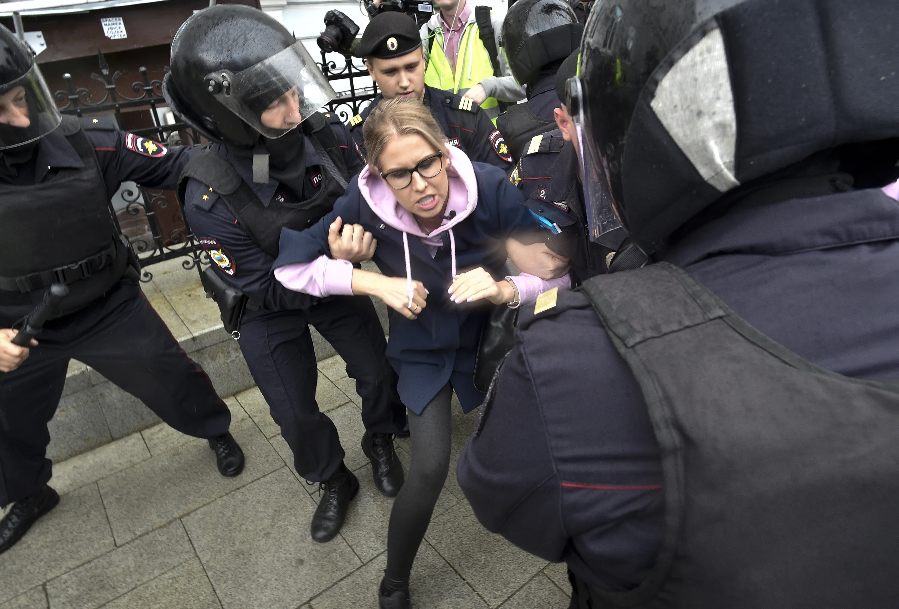 Police officers detain an opposition candidate and lawyer at the Foundation for Fighting Corruption Lyubov Sobol in the center of Moscow, Russia, Saturday, August 3, 2019. Moscow police detained more than 300 people Saturday who are protesting the exclusion of some independent and opposition candidates from the city council ballot, a monitoring group said. (Photo by Dmitry Serebryakov/AP Photo)